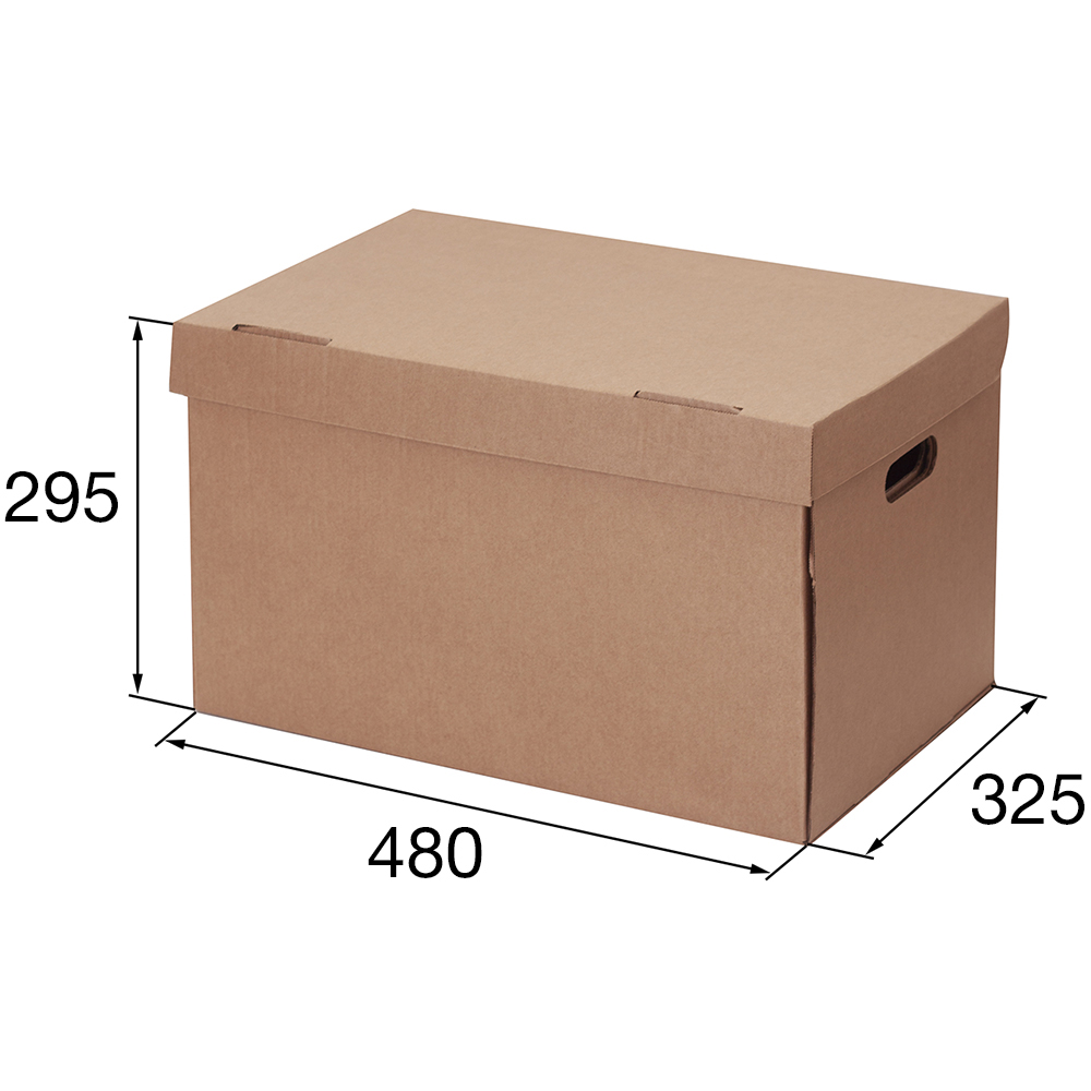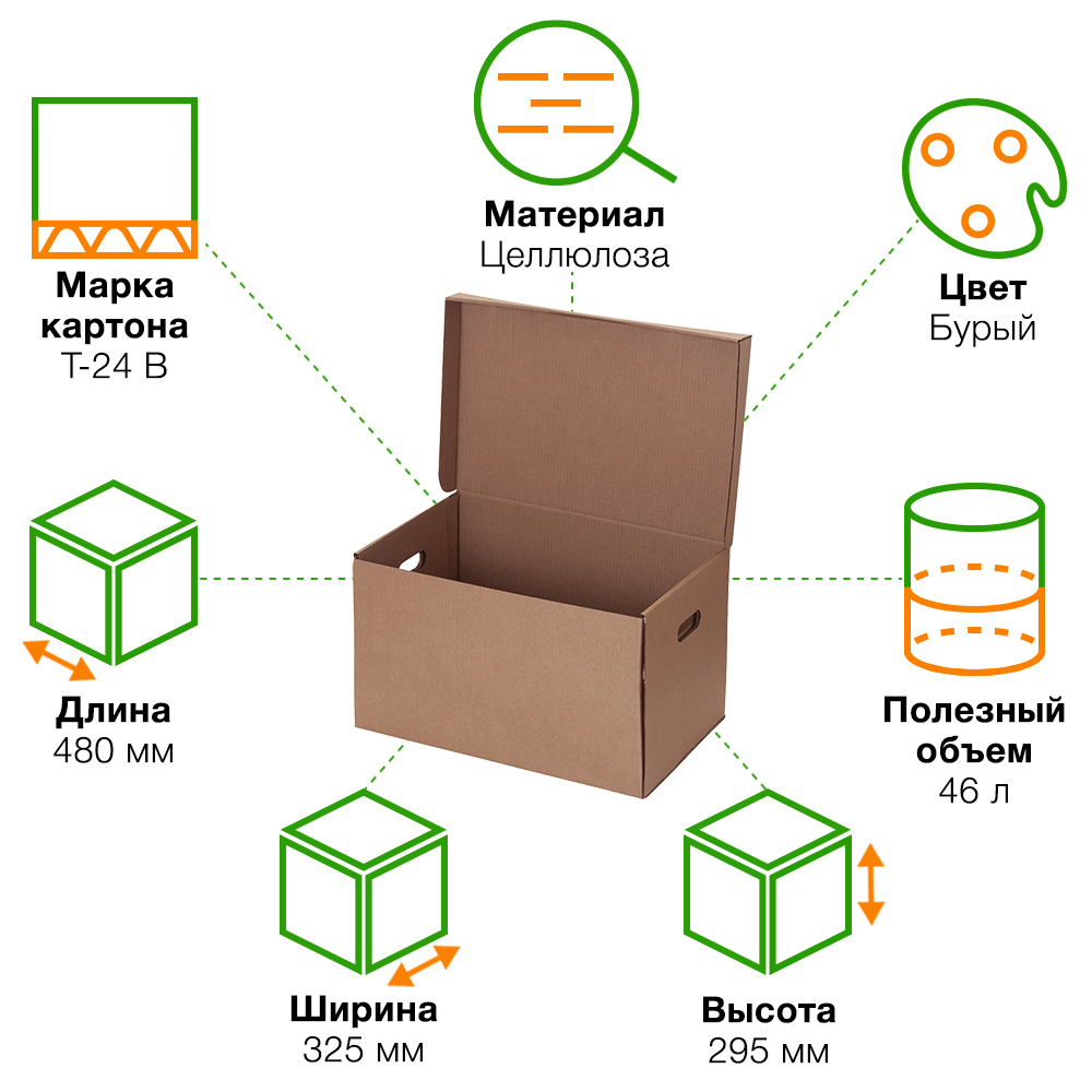 Короб архивный самосборный с крышкой, длиной 480 мм, шириной 325 мм и высотой 295 мм. Изготовлен из трёхслойного гофрокартона марки Т-24 В. Полезный объём — 46 л.