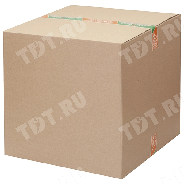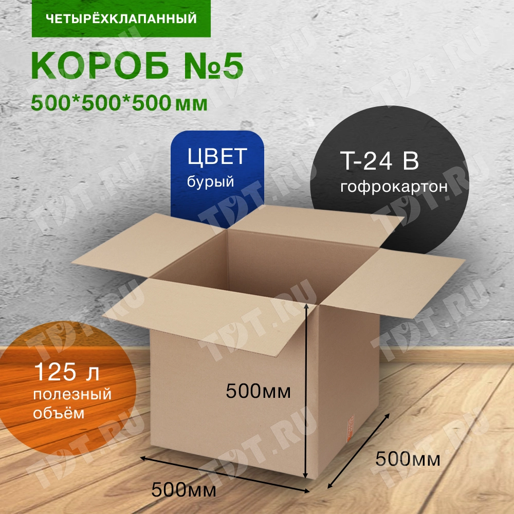 Картонный короб №5 для хранения вещей (большой), длиной 500 мм, шириной 500 мм и высотой 500 мм. Изготовлен из трехслойного картона марки Т-24. Полезный объём — 125 л.