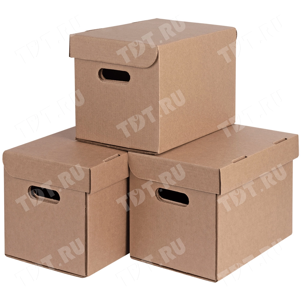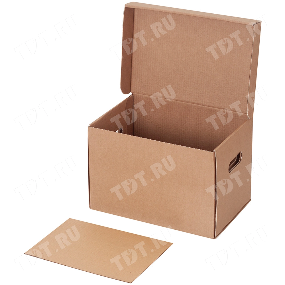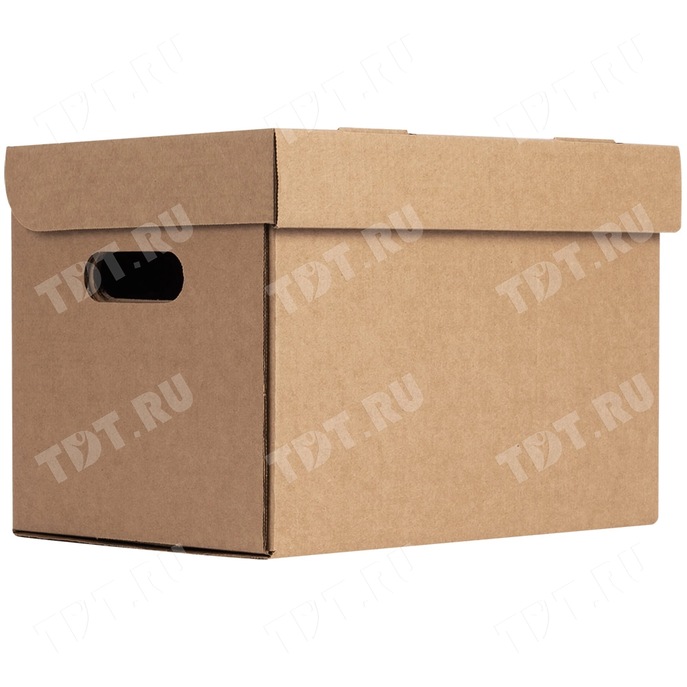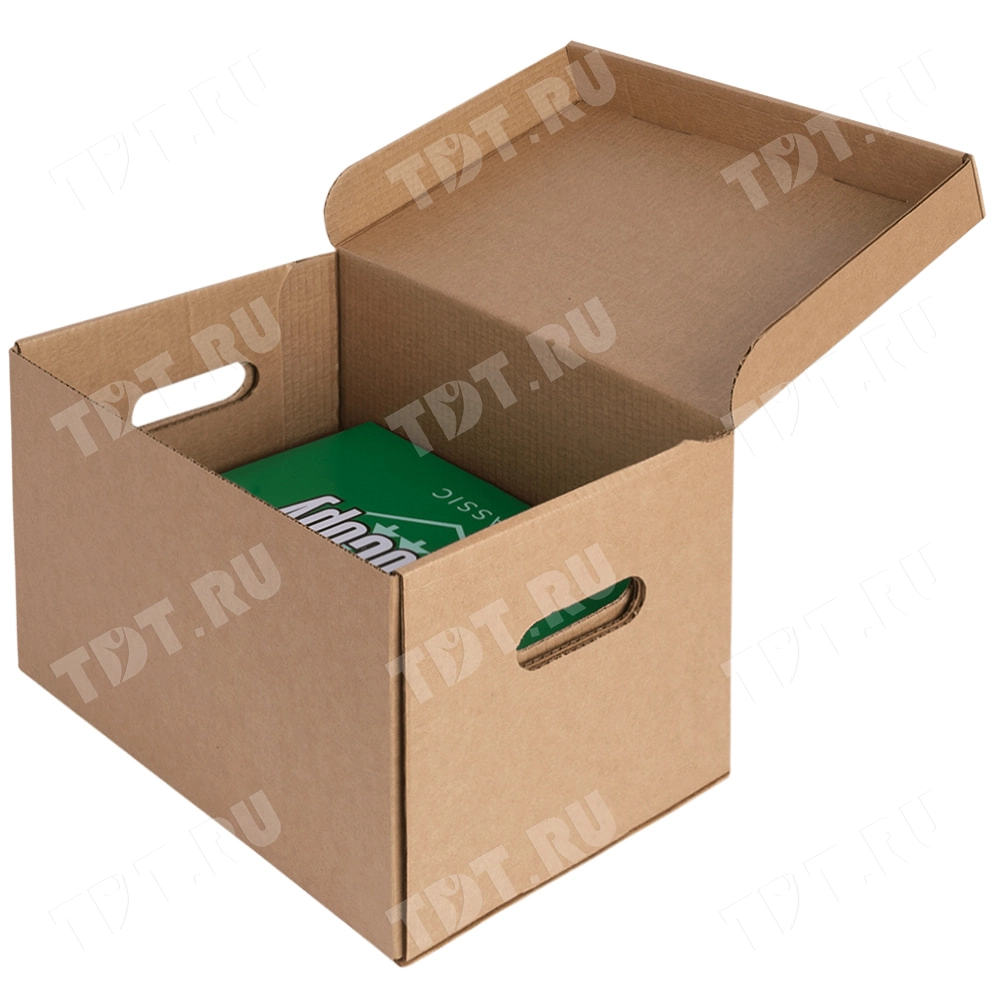 Архивный короб №9 формата А4, длиной 330 мм, шириной 230 мм и высотой 230 мм. Изготовлен из трёхслойного гофрокартона марки Т-24 В. Полезный объём — 17.5 л.