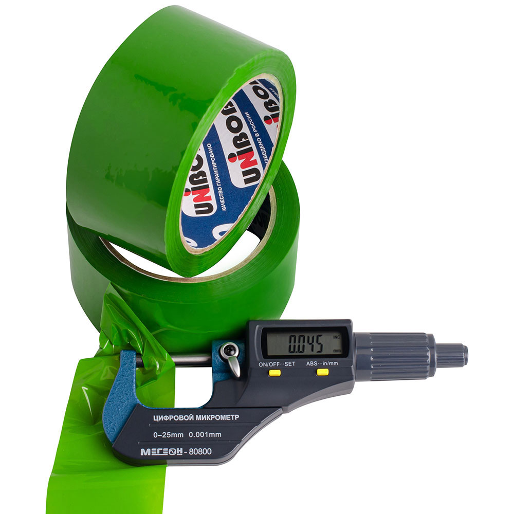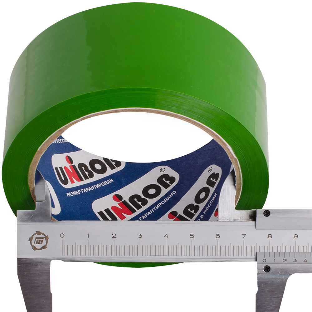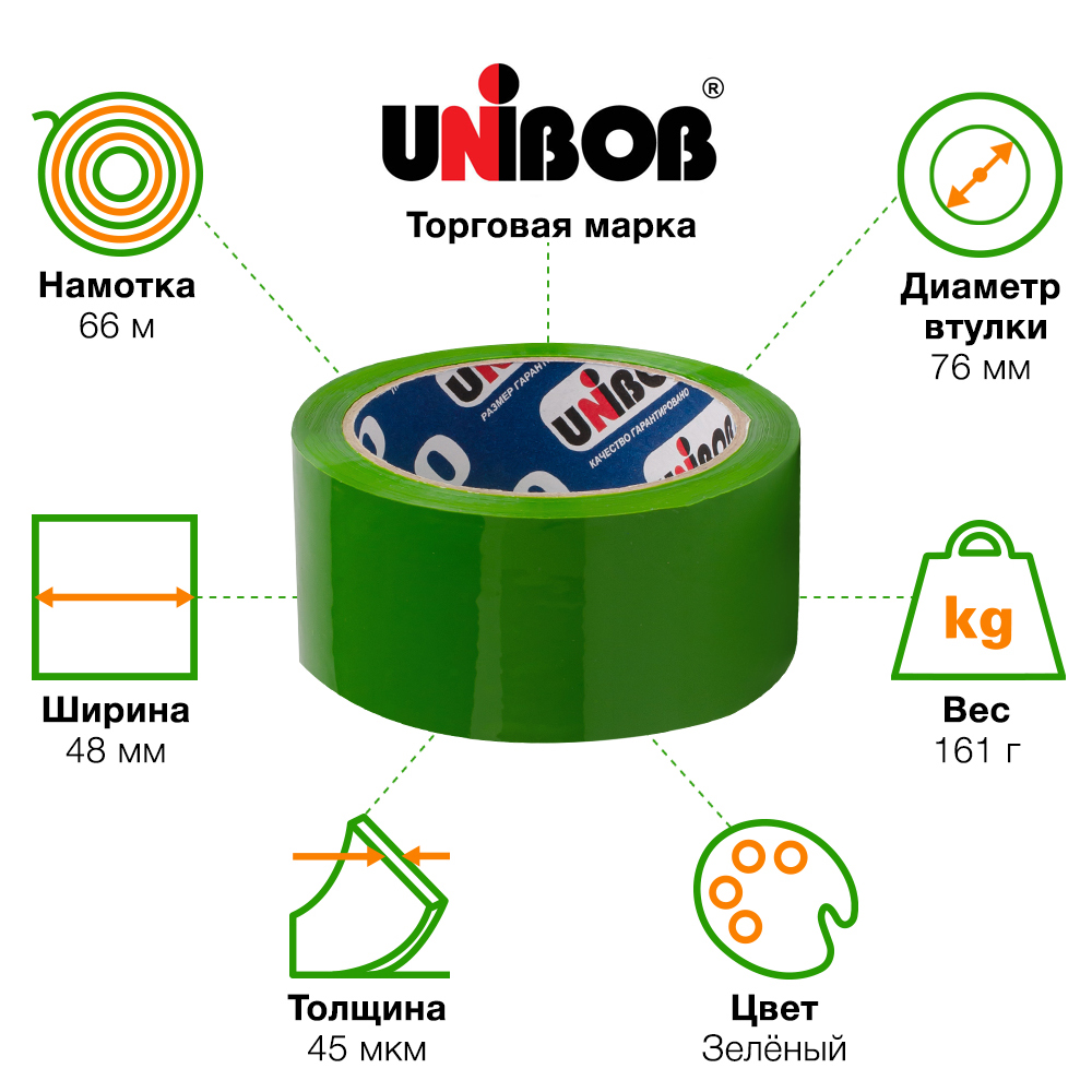 Зеленая клейкая лента Unibob® шириной 48 мм, диаметром втулки 76 мм, намоткой 66 метров. Изготовлена на основе полипропилена.