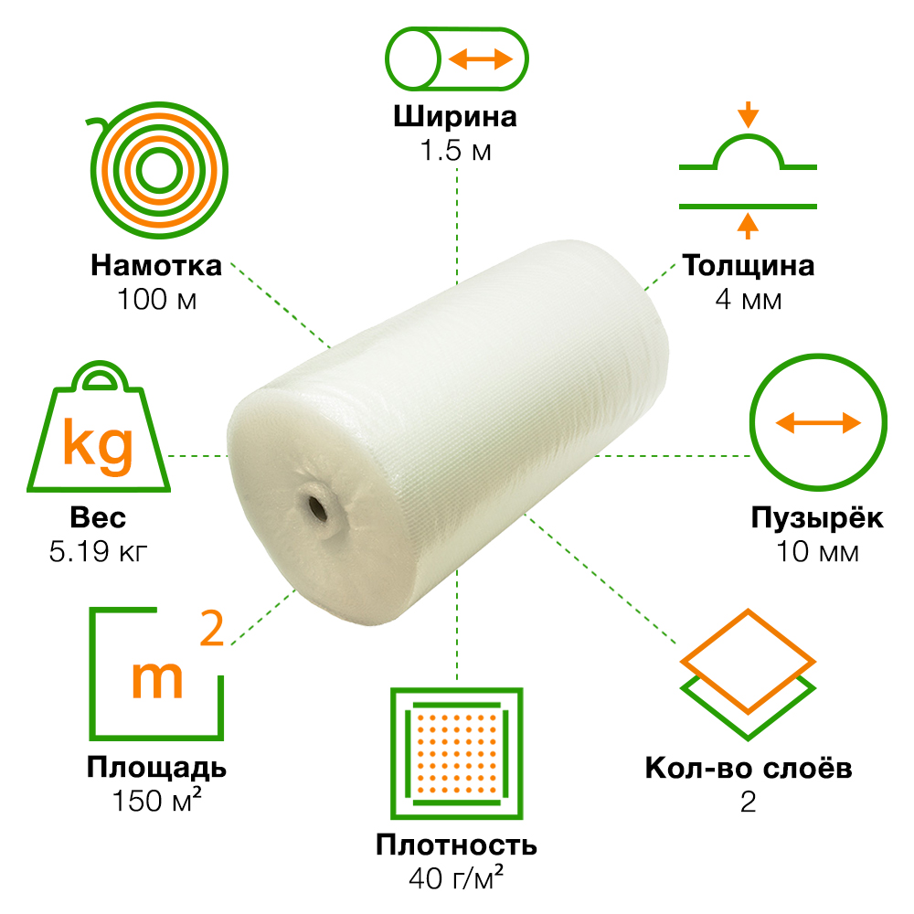 Прозрачная двухслойная воздушно-пузырчатая пленка «Стандарт», намоткой 100 м, шириной рулона 1.5 м, диаметром пузырька 10 мм, плотностью 40 г/м². Изготовлена из полиэтилена. Производится в России.