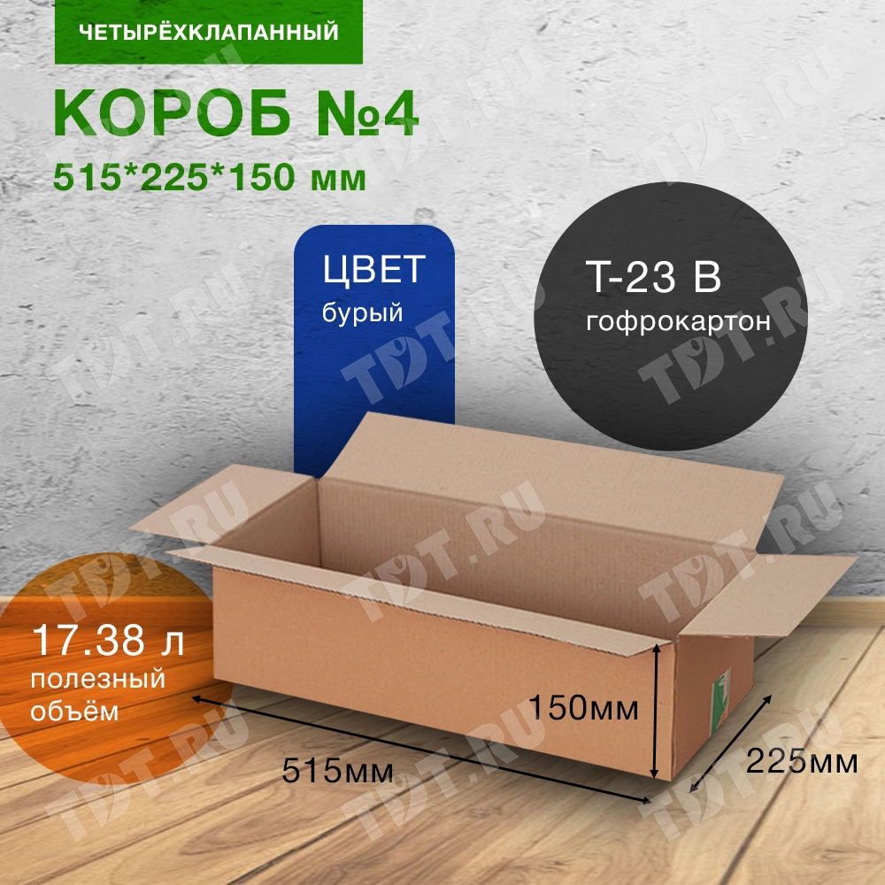 Короб №4 (классический) с длиной 515 мм, шириной 225 мм и высотой 150 мм. Изготовлен из трёхслойного гофрокартона марки Т-23 В. Полезный объём — 17.38 л.