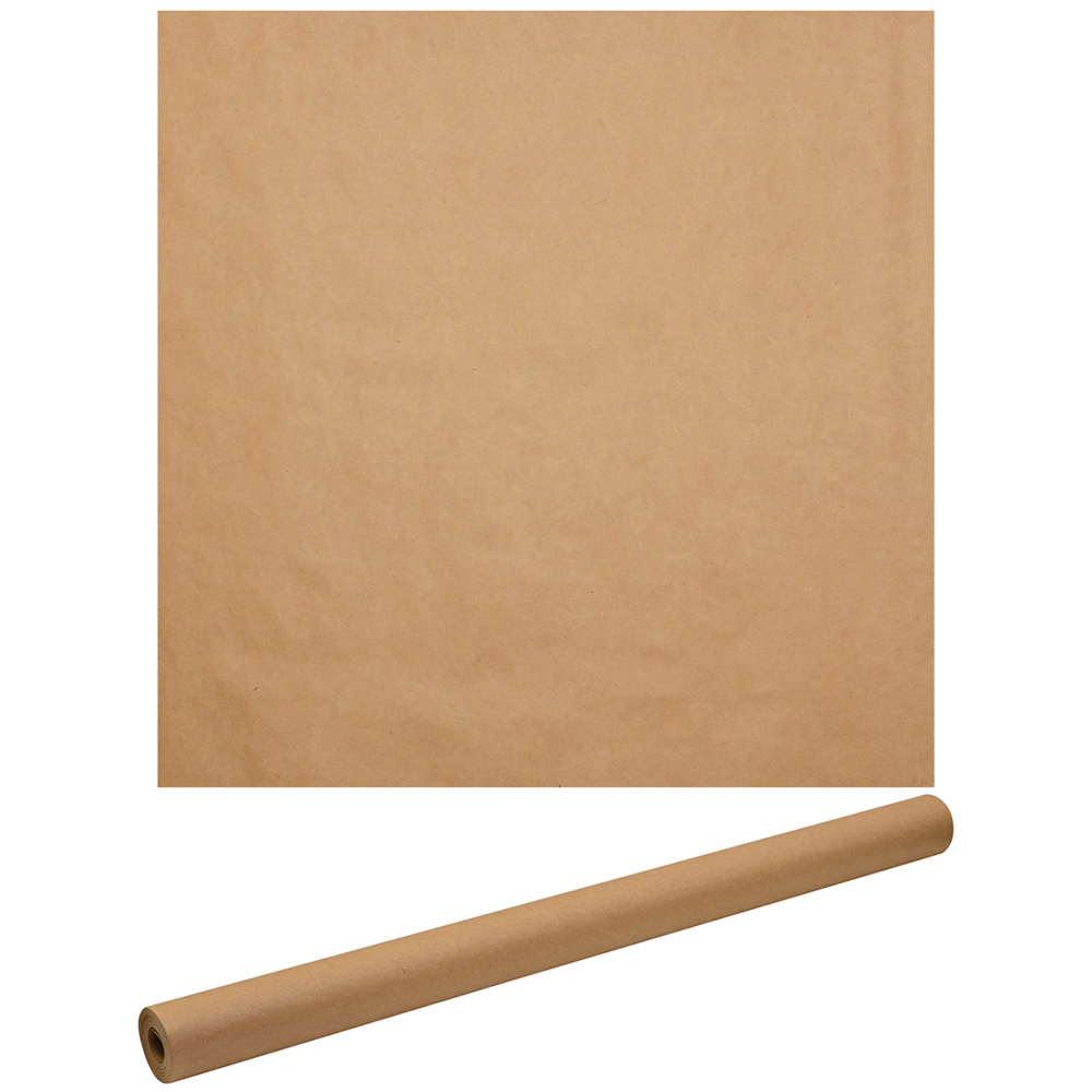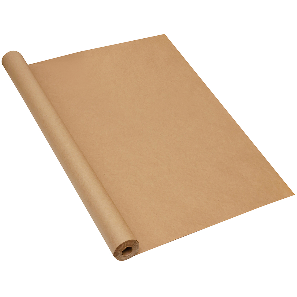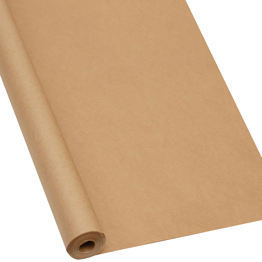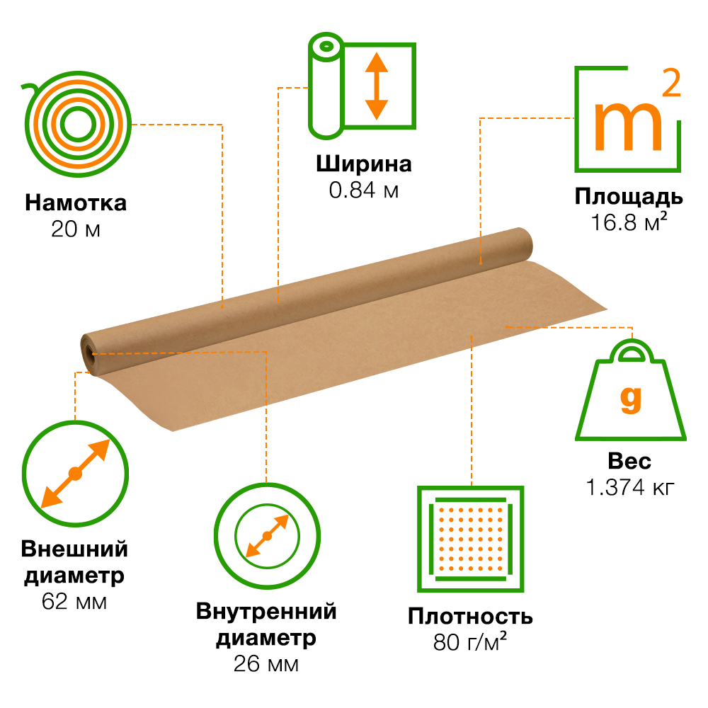 Оберточная крафт бумага в рулоне, шириной 84 см, намоткой 20 м, плотностью 80 г/м². Производится в России.