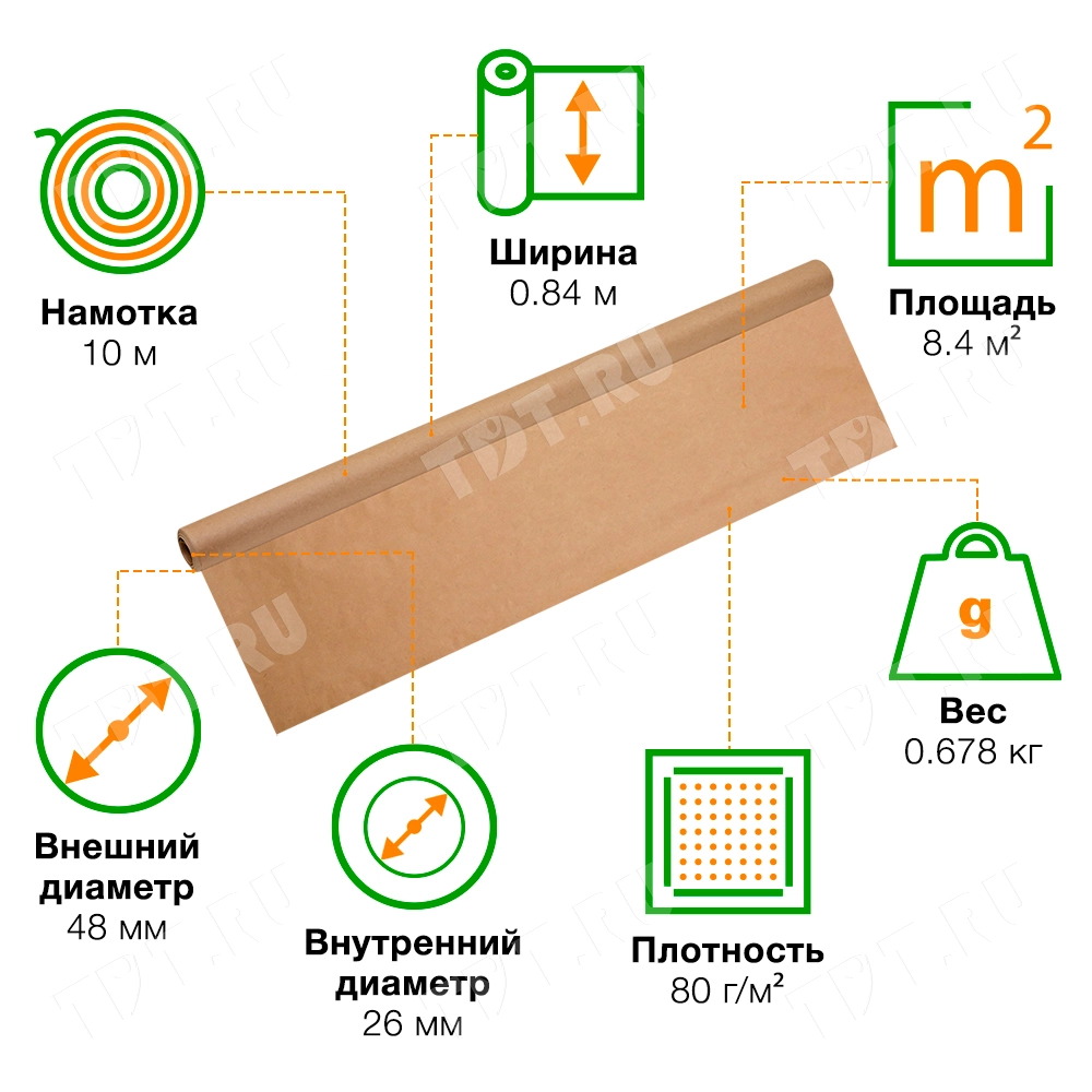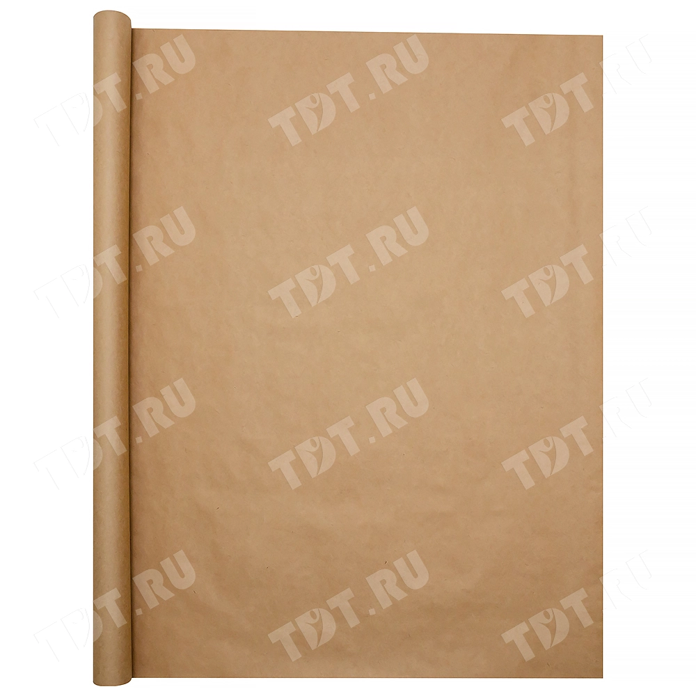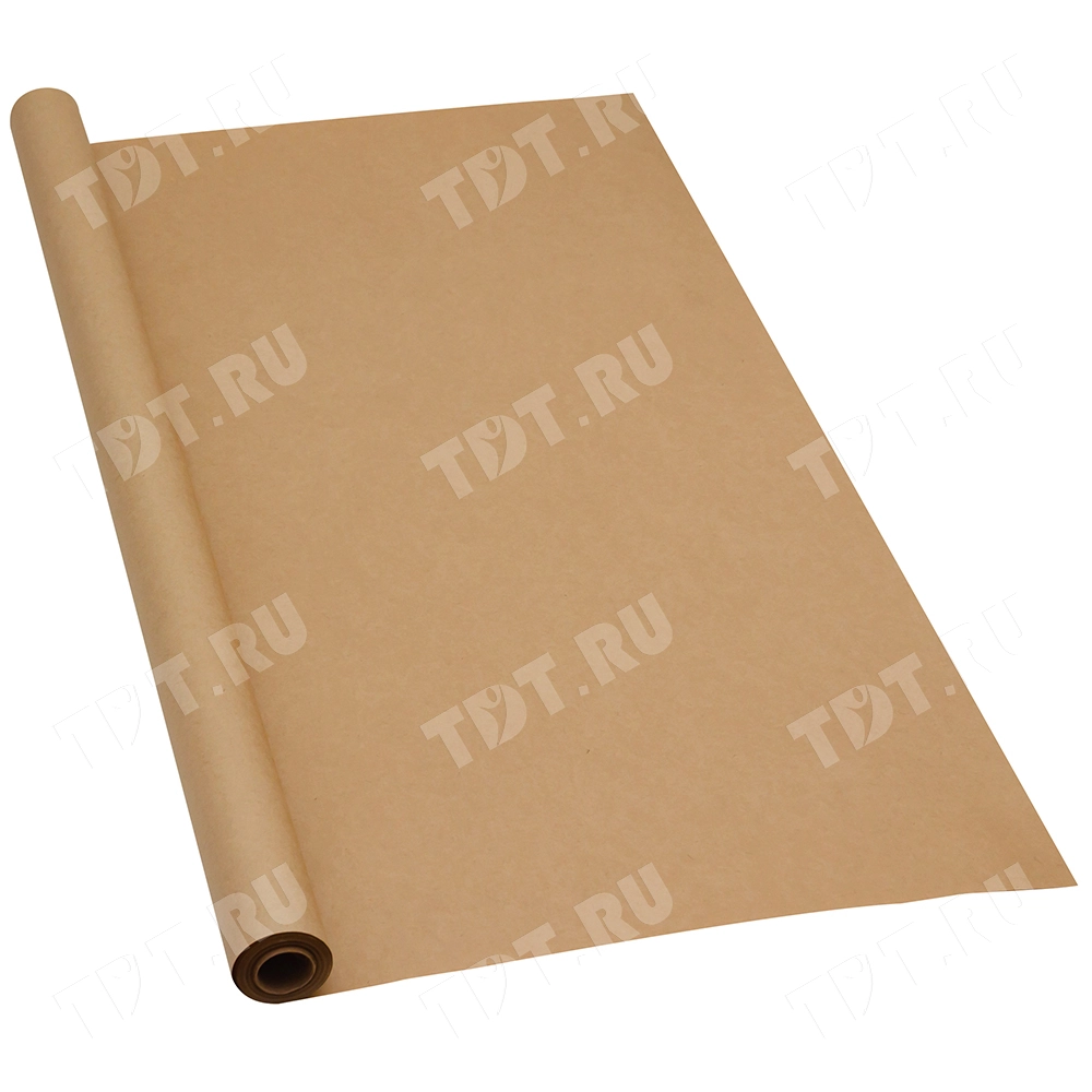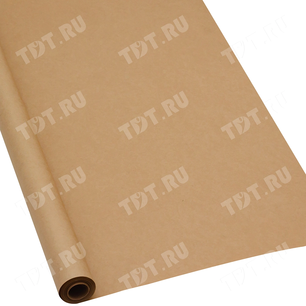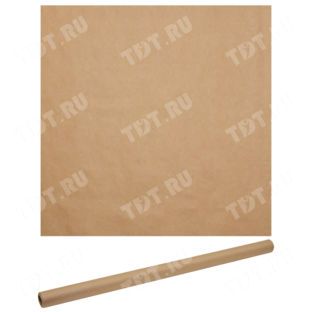 Оберточная крафт бумага в рулоне, шириной 84 см, намоткой 10 м, плотностью 80 г/м². Производится в России.