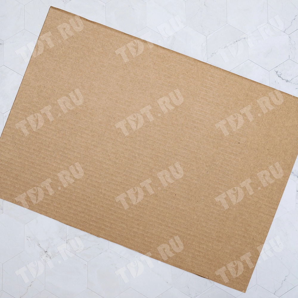 Трехслойный лист гофрокартона, бурого цвета марки Т-21 В, длиной 2060 мм, шириной 1200 мм, толщиной 2.5-3.2 мм, площадью 2.47 м², направление волны вдоль стороны 1200 мм. Производится в России.