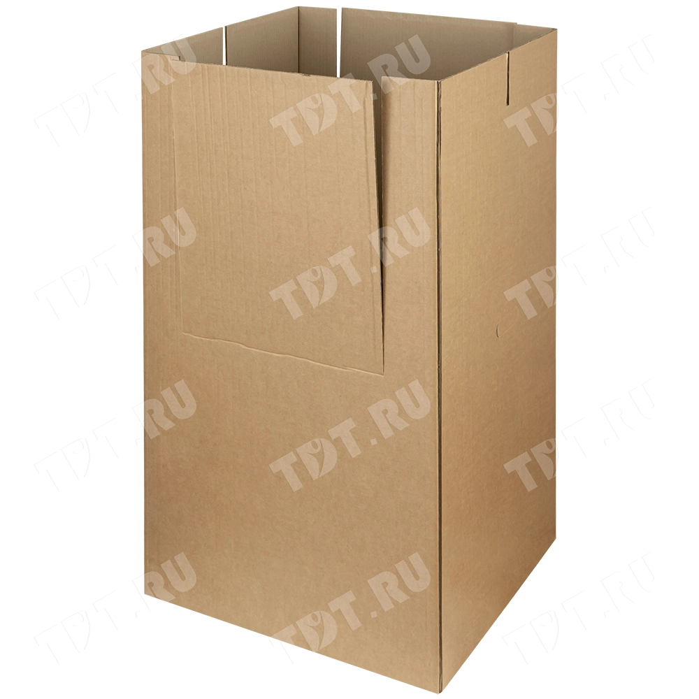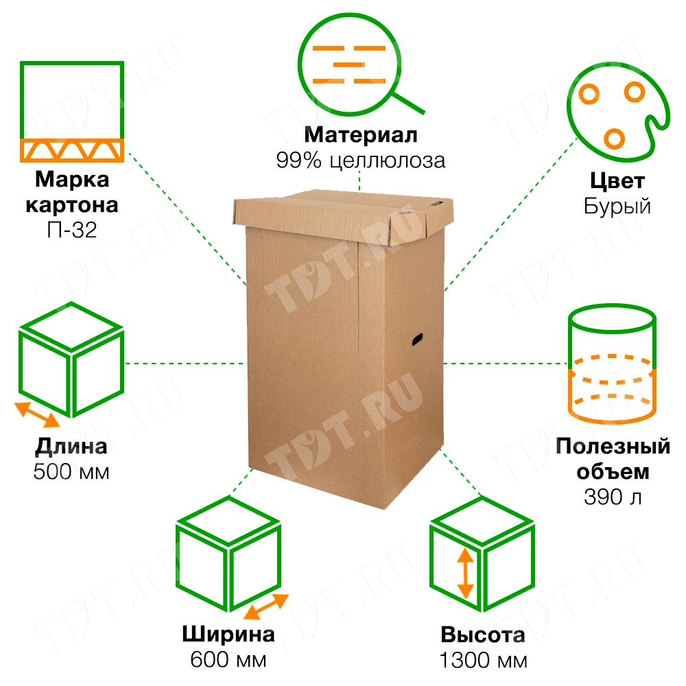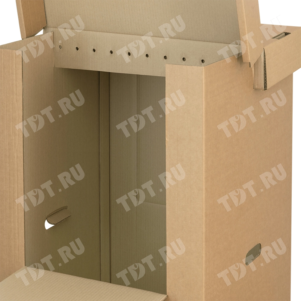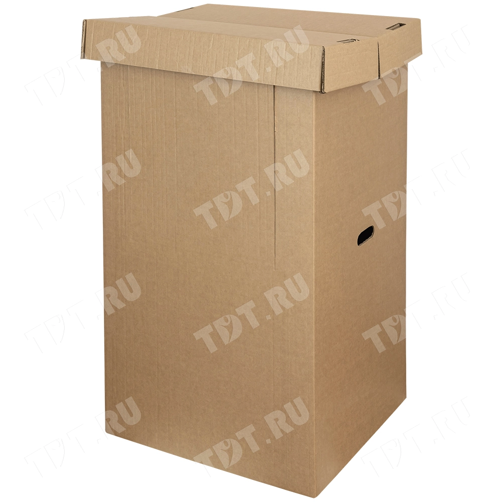 Картонный короб №15 (гардеробный), с ручками и крышкой, длиной 500 мм, шириной 600 мм и высотой 1300 мм. Изготовлен из пятислойного картона марки П-32. Полезный объём — 390 л. Для удобной переноски на коробке предусмотрены ручки.