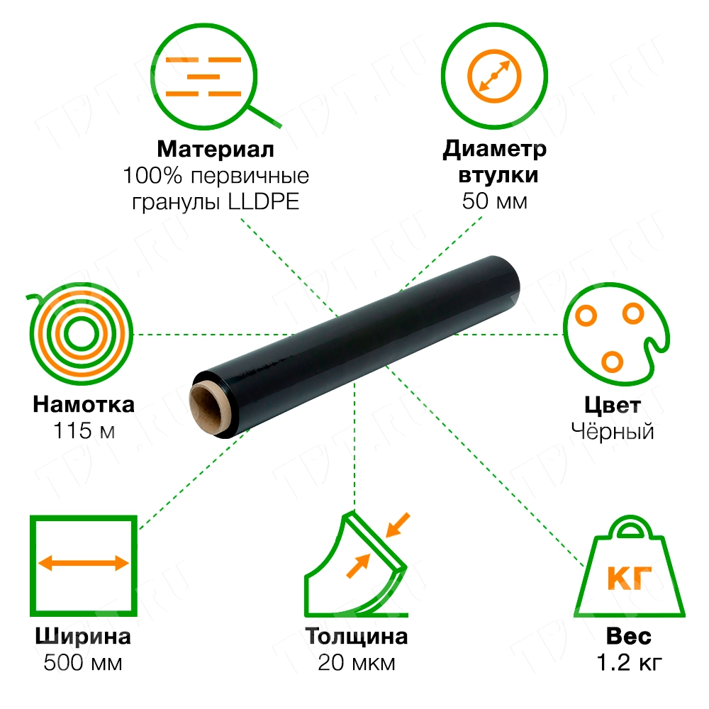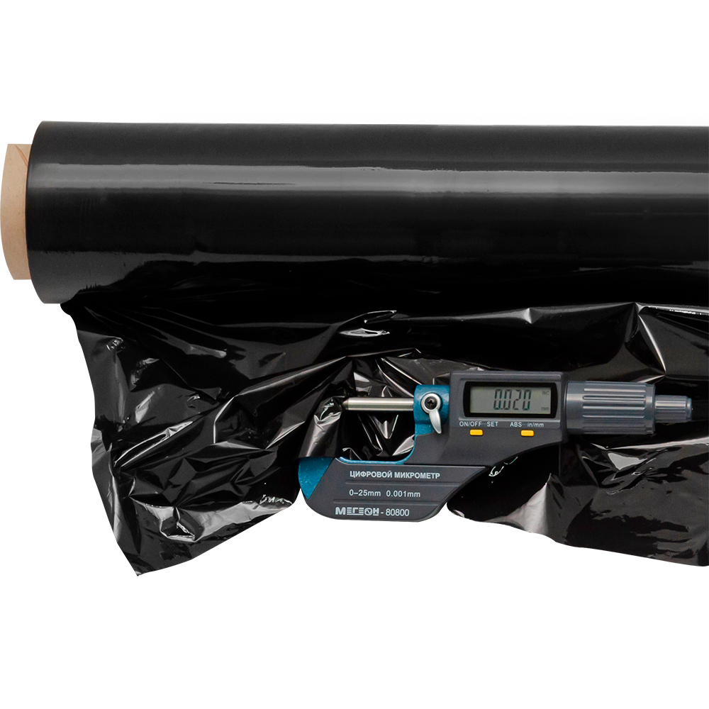 Толщина этой чёрной стрейч плёнки не отличается от толщины стандартной прозрачной и составляет 20 мкм.