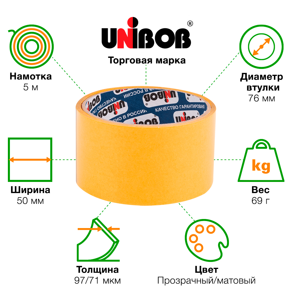 Универсальная двухсторонняя клейкая лента на полипропиленовой основе TM UNIBOB® поможет при монтажных, отделочных, оформительских (дизайнерских) работах, а также в упаковке вещей. Лента TM UNIBOB® – современная замена механическим крепежным элементам.