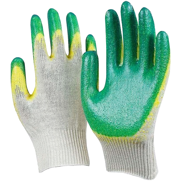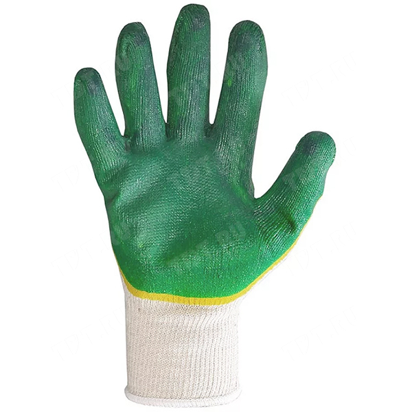 Перчатки х/б с двухслойным латексным покрытием, зеленого цвета. Защищают руки от различных повреждений и загрязнений. Производятся в России.
