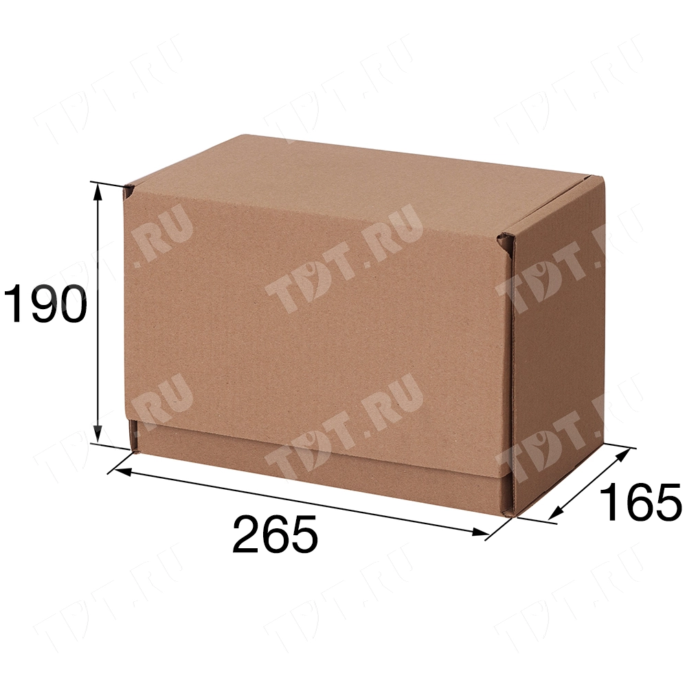 Почтовый короб тип «Г» бурого цвета, длиной 265 мм, шириной 165 мм и высотой 190 мм. Изготовлен из трёхслойного гофрокартона Т-23 В. Полезный объём — 8.31 л.