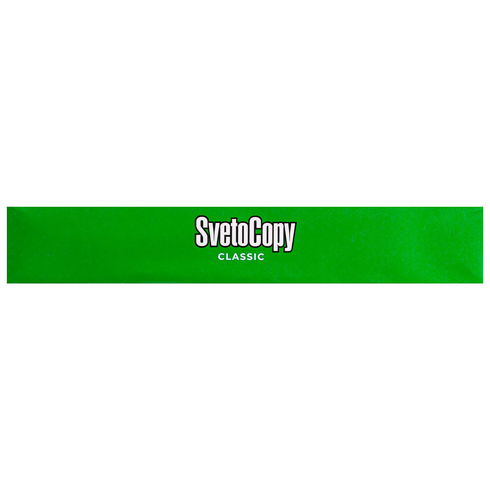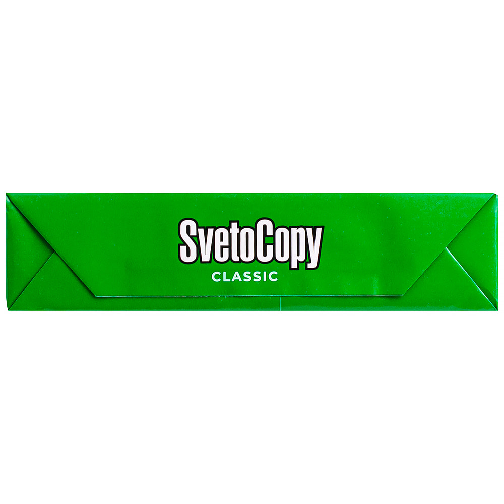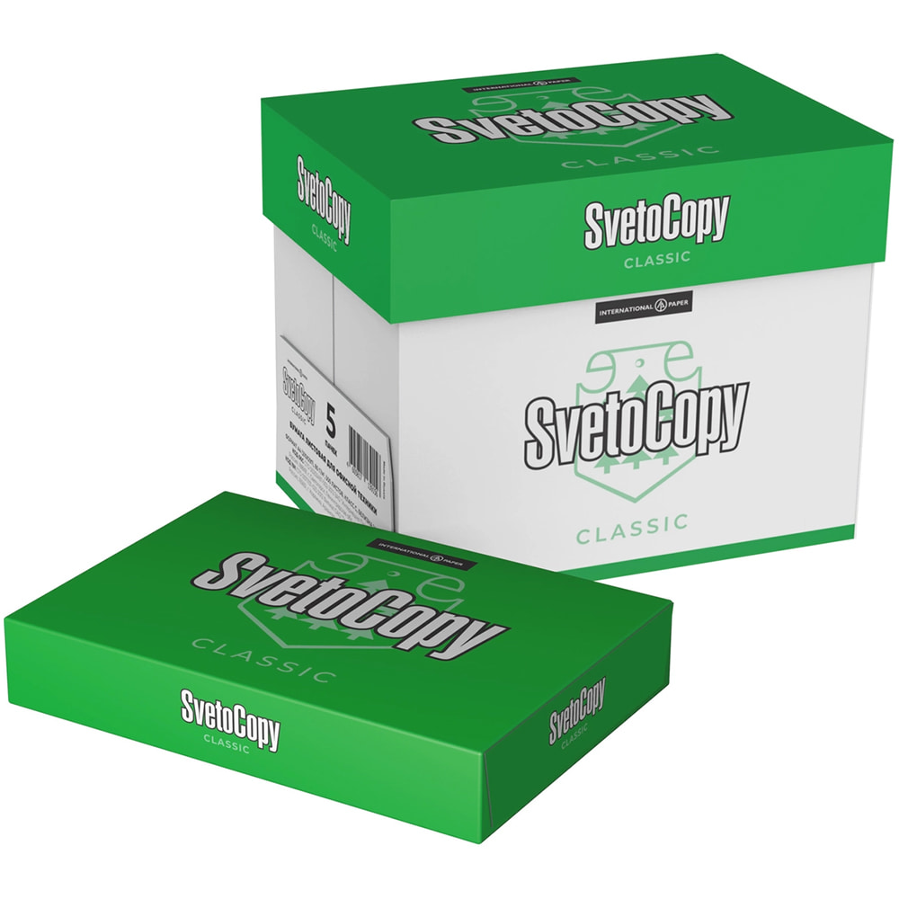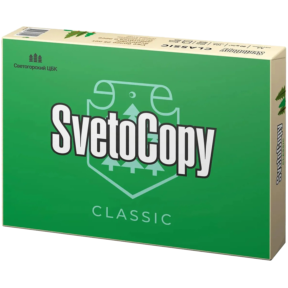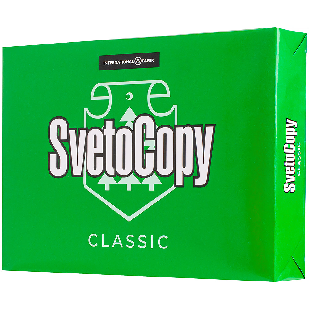 Универсальная офисная бумага SvetoCopy Classic (белого цвета), формата А4, диной 297 мм, шириной 210 мм, классом бумаги C, плотностью бумаги 80 г/м², толщиной 104 мкм, белизной 146%, непрозрачностью 91%, в упаковке по 500 штук, весом 2.456 кг. Производится в России.