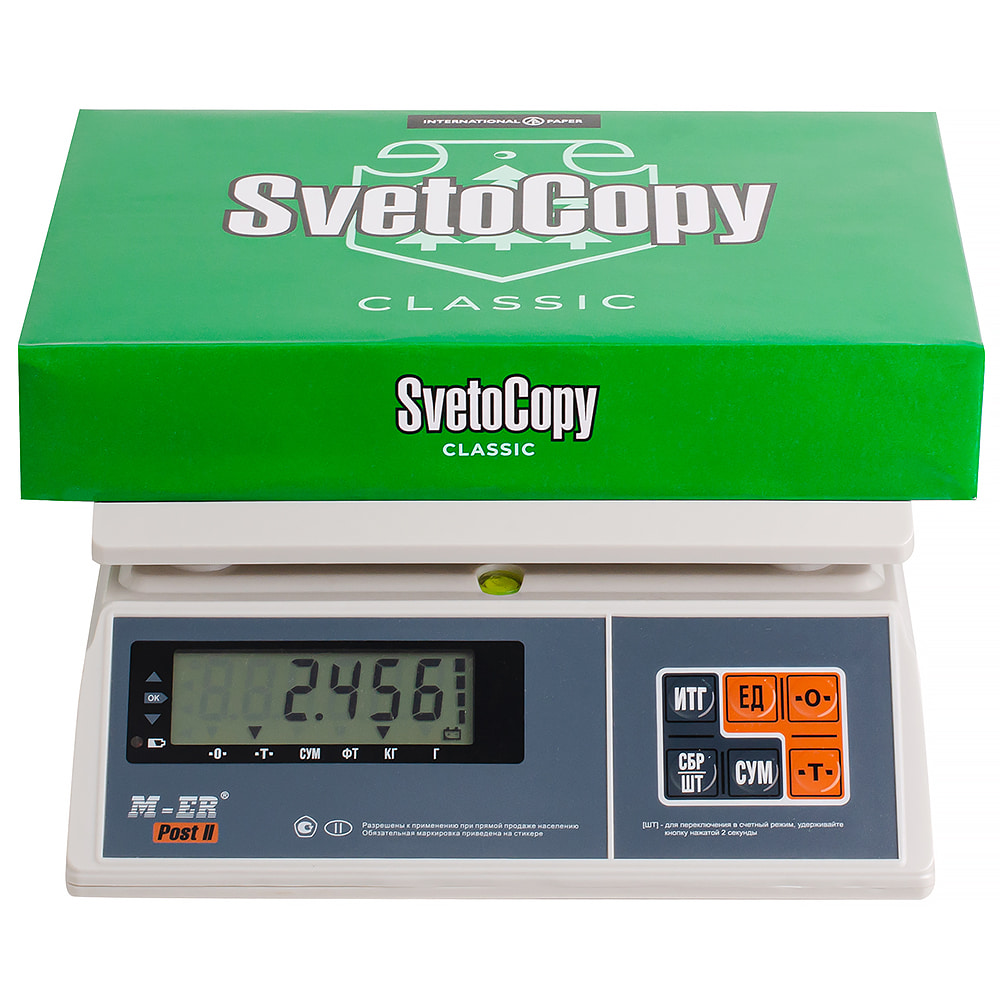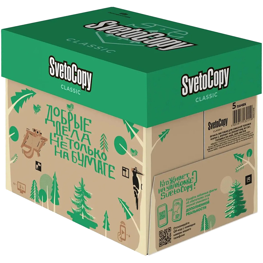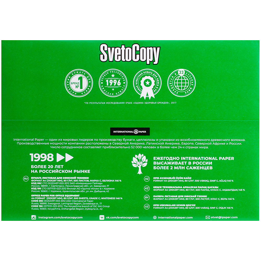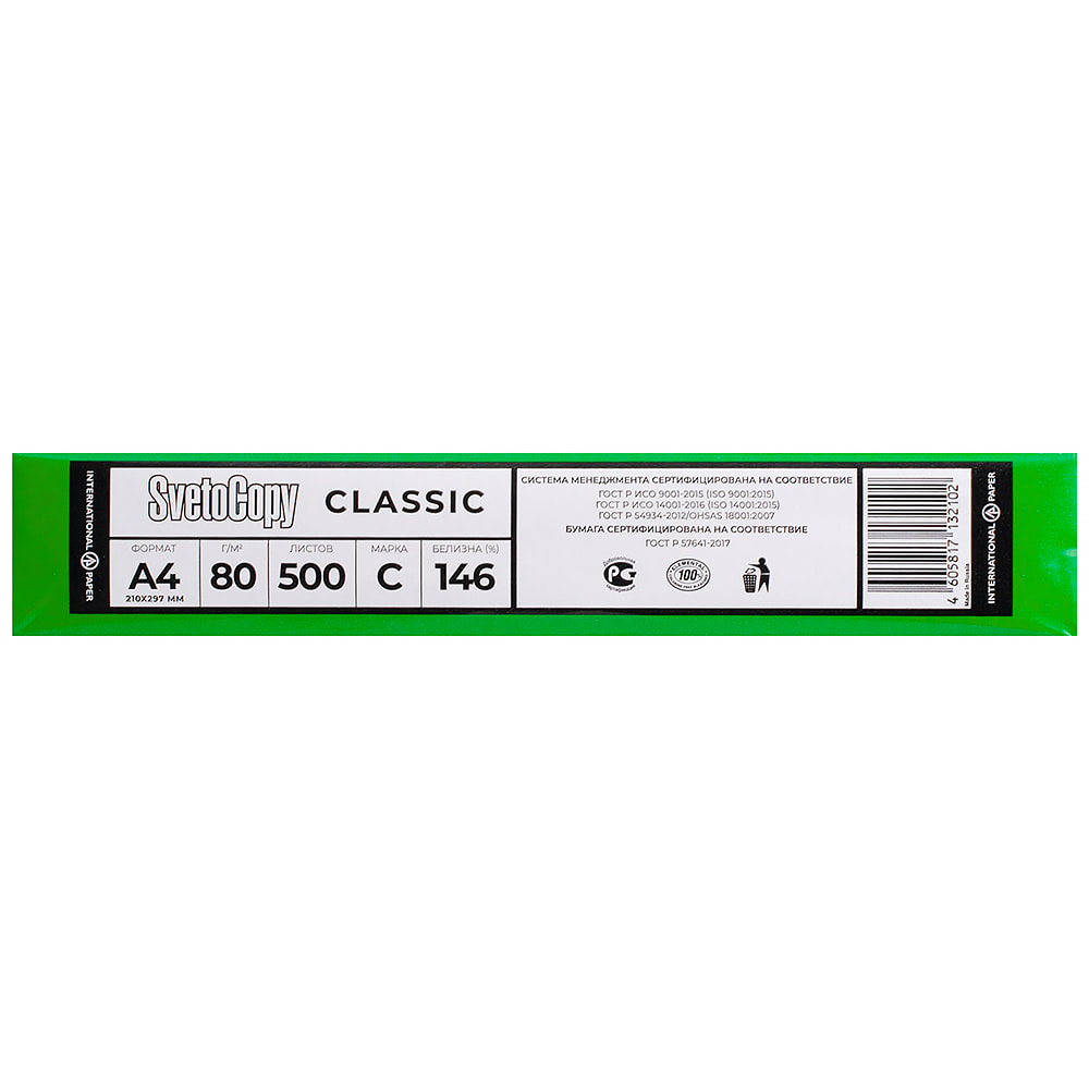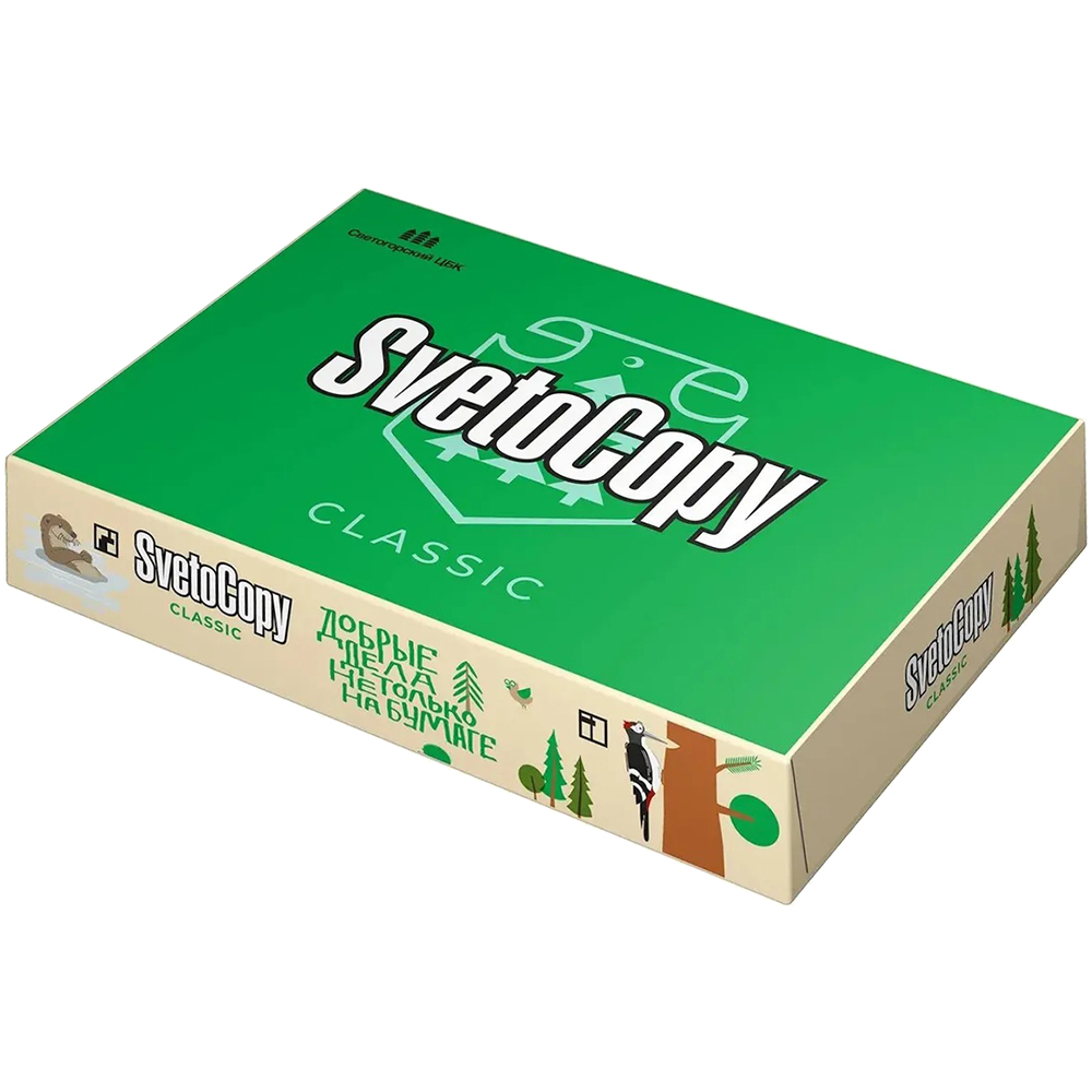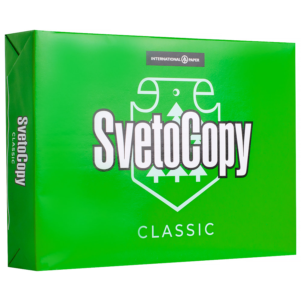 Универсальная офисная бумага SvetoCopy Classic (белого цвета), формата А4, диной 297 мм, шириной 210 мм, классом бумаги C, плотностью бумаги 80 г/м², толщиной 104 мкм, белизной 146%, непрозрачностью 91%, в упаковке по 500 штук, весом 2.456 кг. Производится в России.