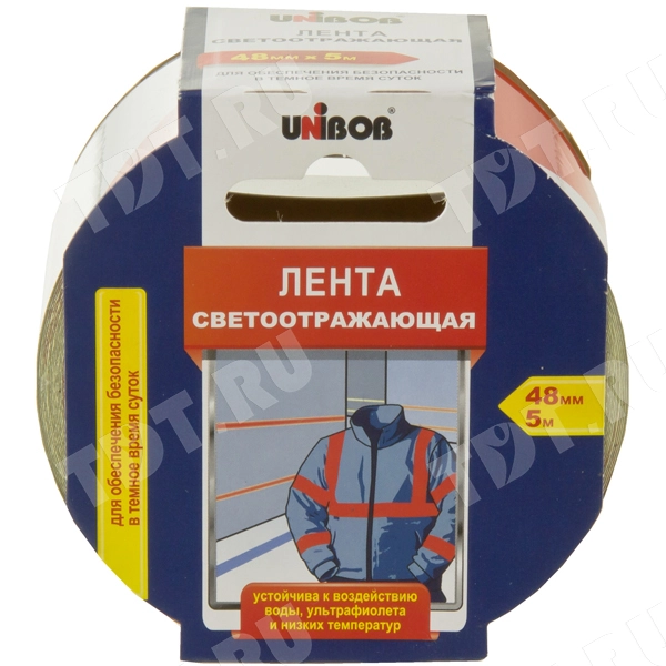 Светоотражающая клейкая лента Unibob шириной 48 мм, диаметром втулки 76 мм, намоткой 5 метров.