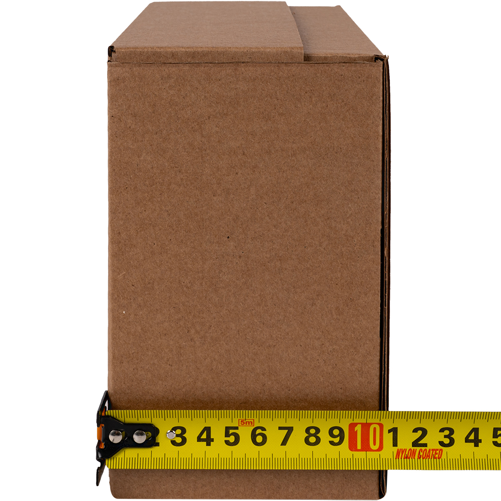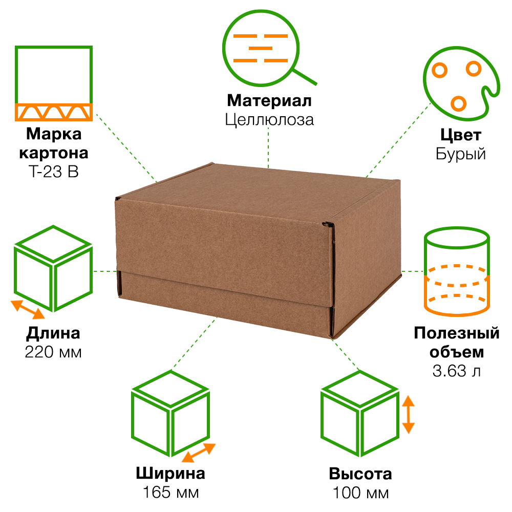 Почтовый короб тип «Д» бурого цвета, длиной 220 мм, шириной 165 мм и высотой 100 мм. Изготовлен из трёхслойного гофрокартона Т-23 В. Полезный объём — 3.63 л.