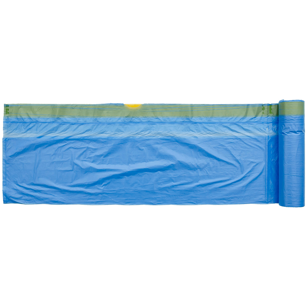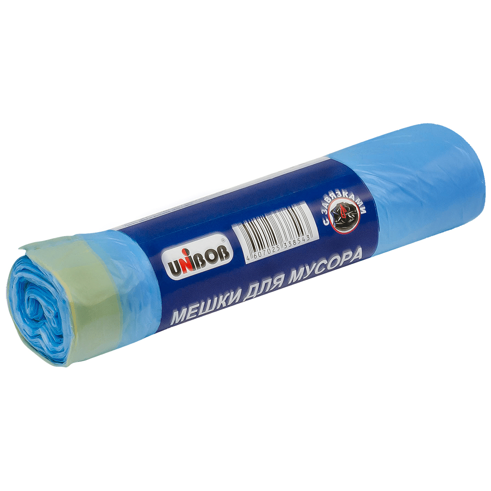 Универсальные мешки Unibob (с завязками) для бытового применения, голубого цвета, объемом 60 л, длиной 70 см, шириной 60 см, толщиной 5 мкм, в упаковке по 20 штук. Изготовлены из полиэтилена низкого давления (ПНД). Производятся в России.