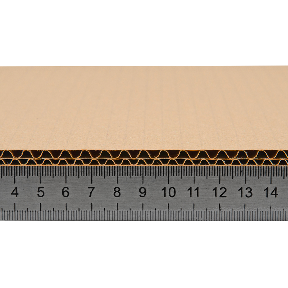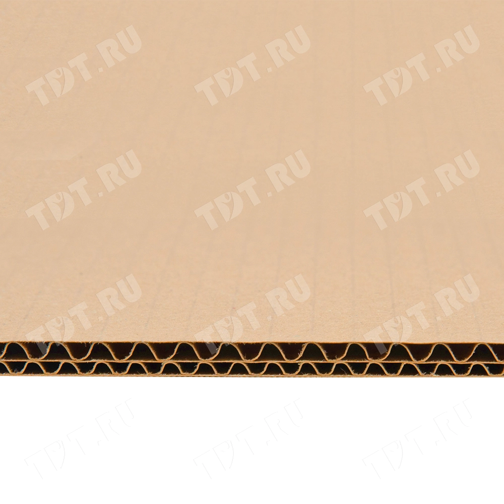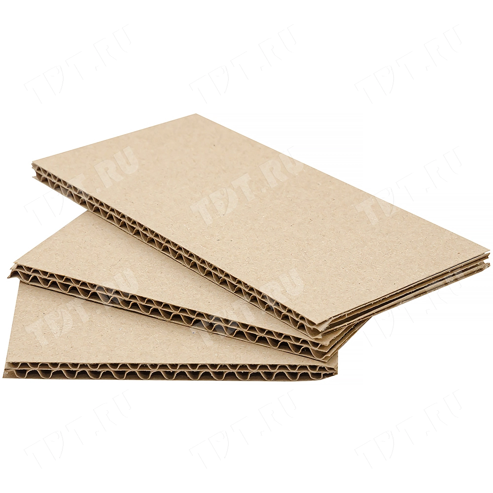 Пятислойный лист гофрокартона, бурого цвета, марки П-32, длиной 1200 мм, шириной 800 мм, толщиной 4.8-6.2 мм, площадью 0.96 м², направление волны вдоль стороны 1200 мм. Для производства листов используется только первичное высококачественное сырье. Производится в России.