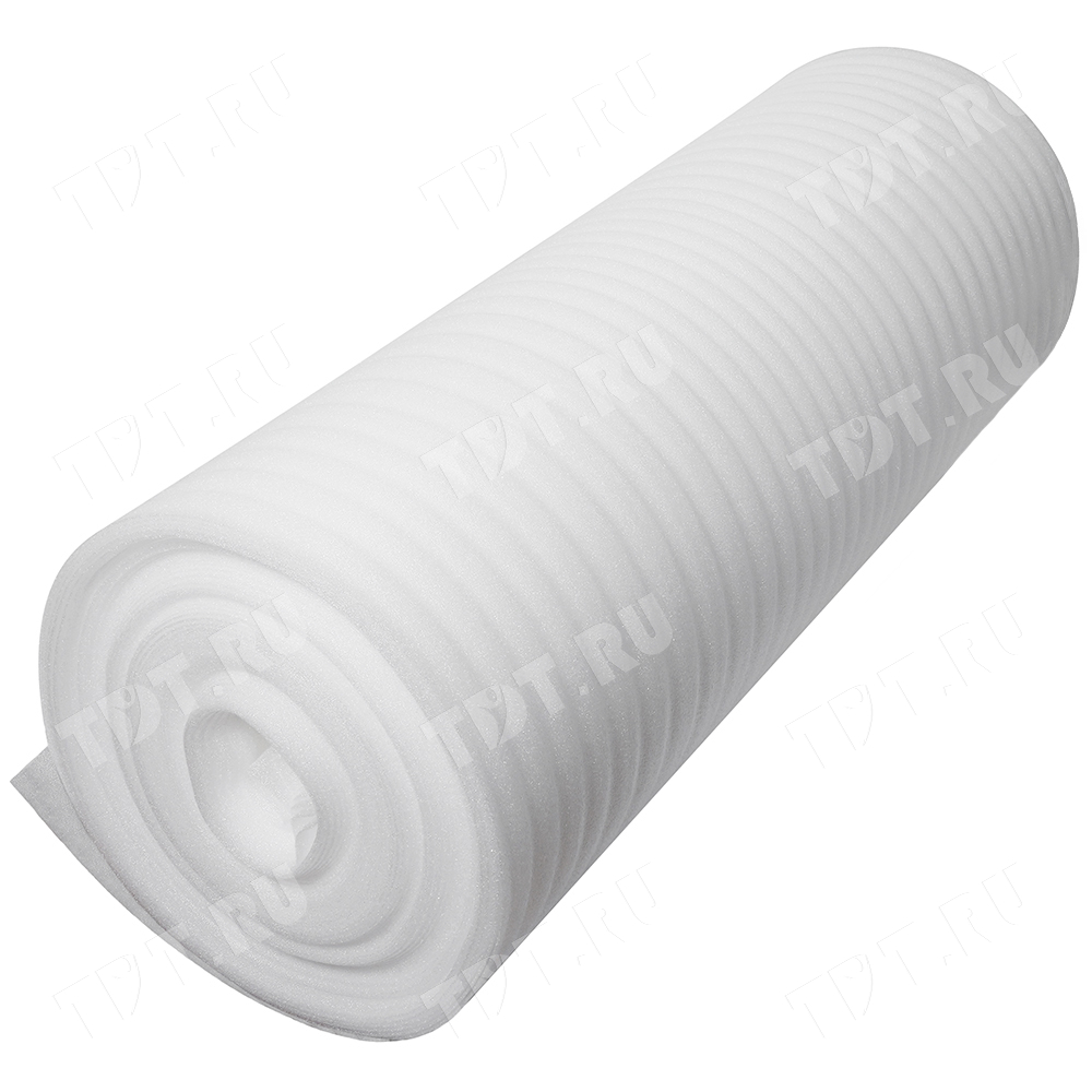 Вспененный полиэтилен, белого цвета, намоткой 50 м, толщиной 5 мм, шириной 1.05 м, весом 6.4 кг, площадью 52.5 м². Рабочий диапазон температур для вспененного полиэтилена от -60 до +100°С. Производится в России.