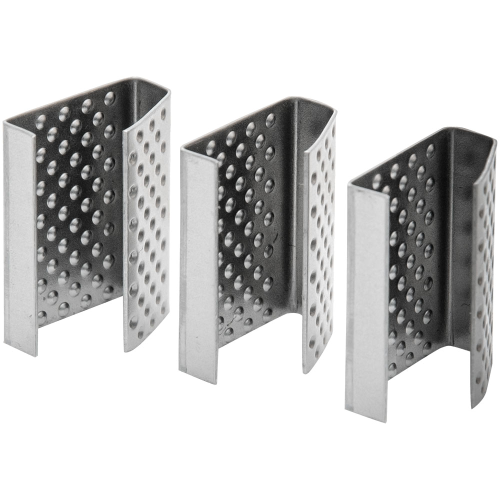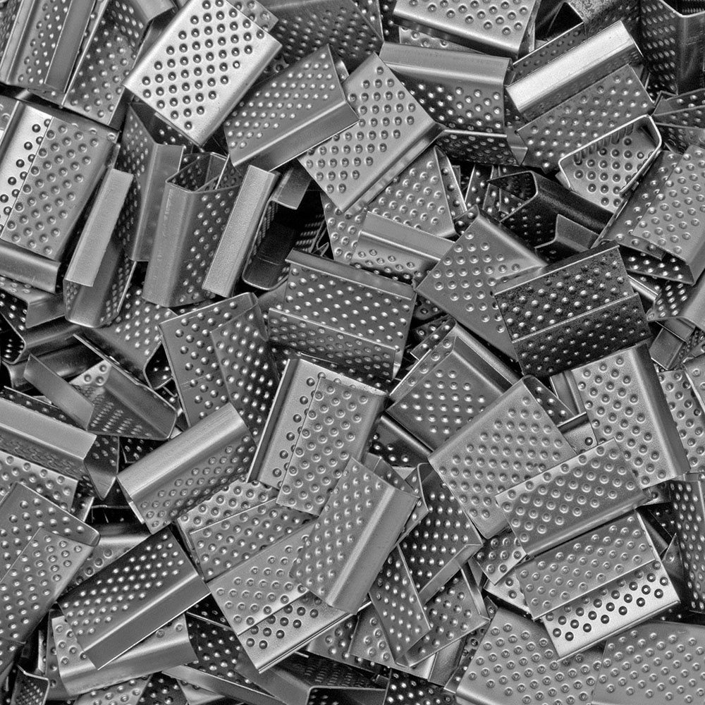 Металлические оцинкованные скобы для полипропиленовых лент (ПП), шириной 16 мм, толщиной 0.5 мм, в упаковке по 1000 шт, весом 3.5 кг, транспортировочным объемом 0.006 м³. Скобы подходят для лент шириной 15 мм. Производятся в России.