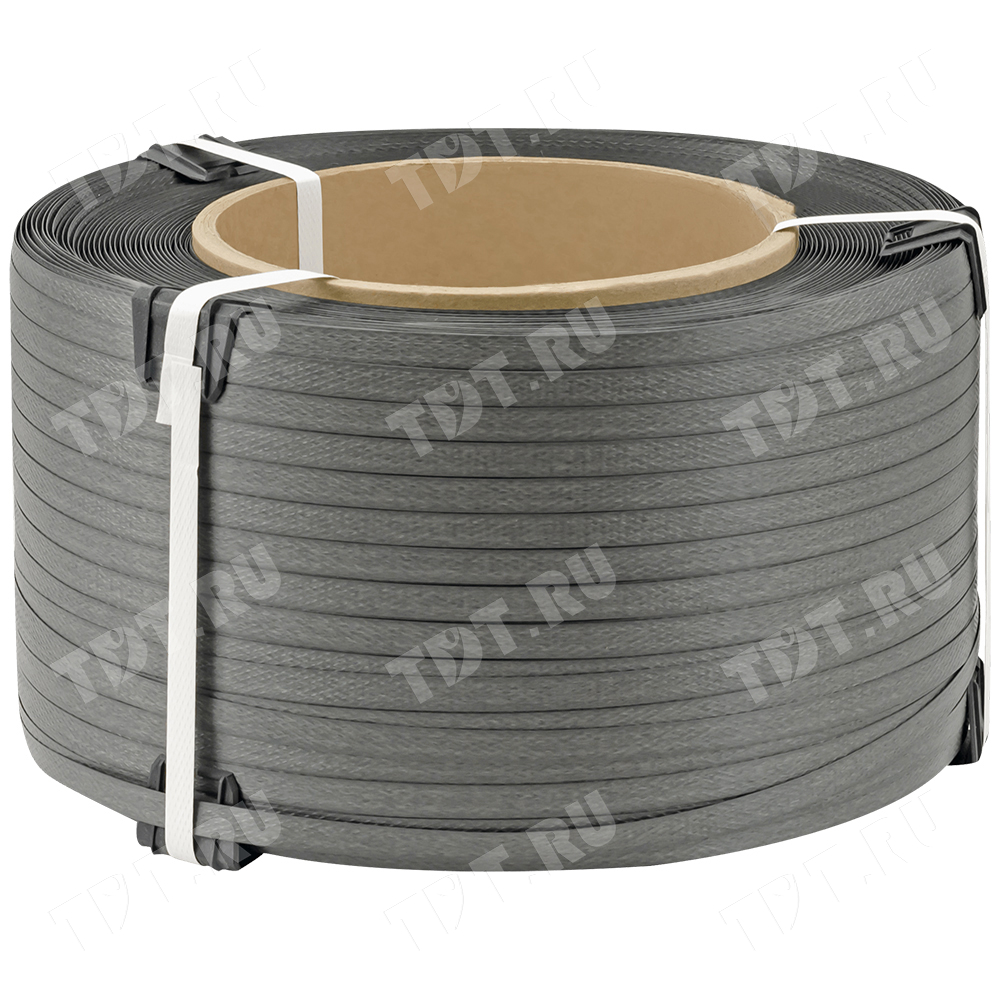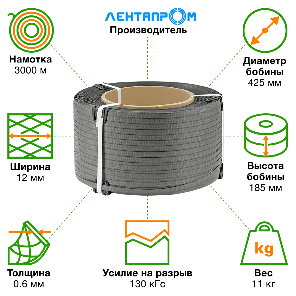 Упаковочная полипропиленовая лента (ПП) Лентапром, серого цвета, намоткой 3000 м, шириной 12 мм, толщиной 0,6 мм, усилием на разрыв 130 кГс, весом 11 кг, транспортировочным объемом 0.033416 м³. Диапазон рабочих температур от -30 до +60°C. Производится в России.