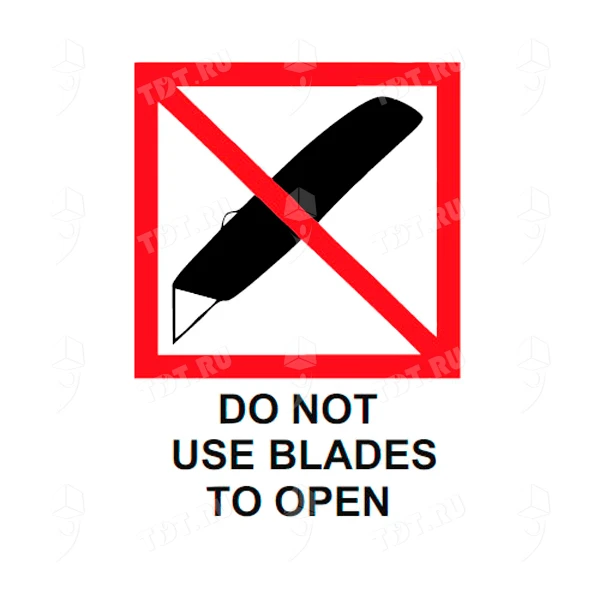 «Не вскрывать ножом» — гласит надпись на английском языке. Кроме того, на наклейке размещено вполне понятная иллюстрация к данному требованию.