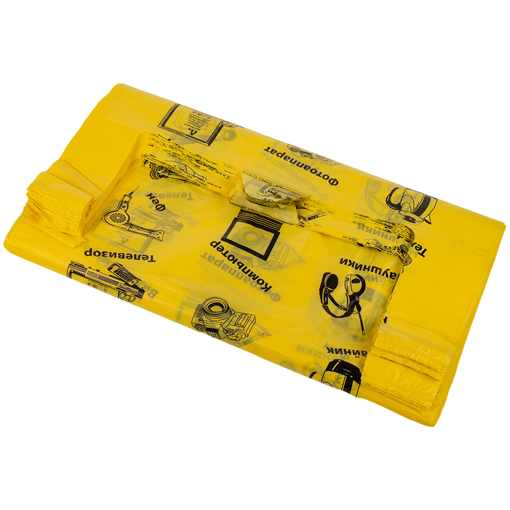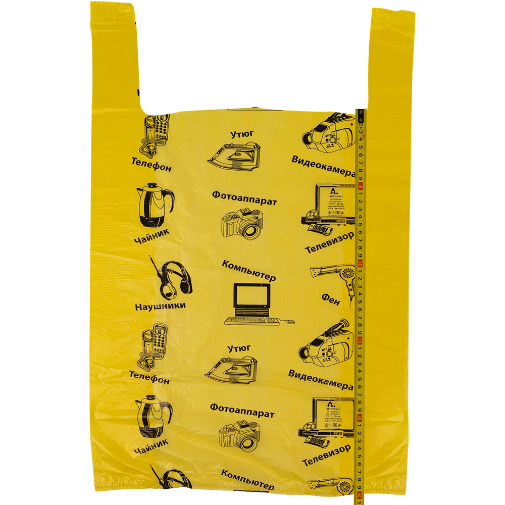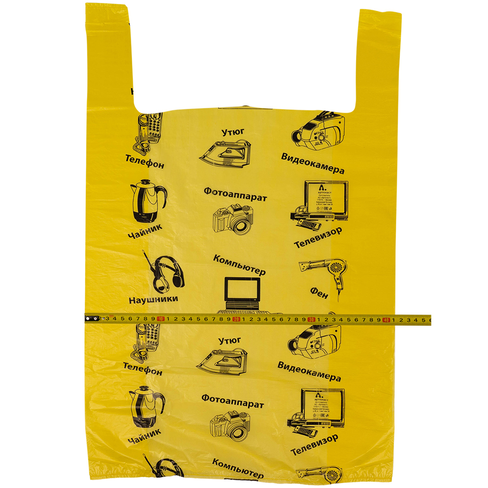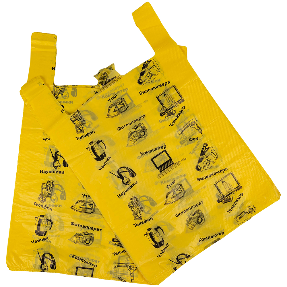Полиэтиленовые пакеты майка ПНД «Электроника» с надписями, желтого цвета, длиной 64 см, шириной 43+20 см, толщиной 23 мкм, в упаковке 50 штук. Материал – полиэтилен низкого давления. Производятся в России.