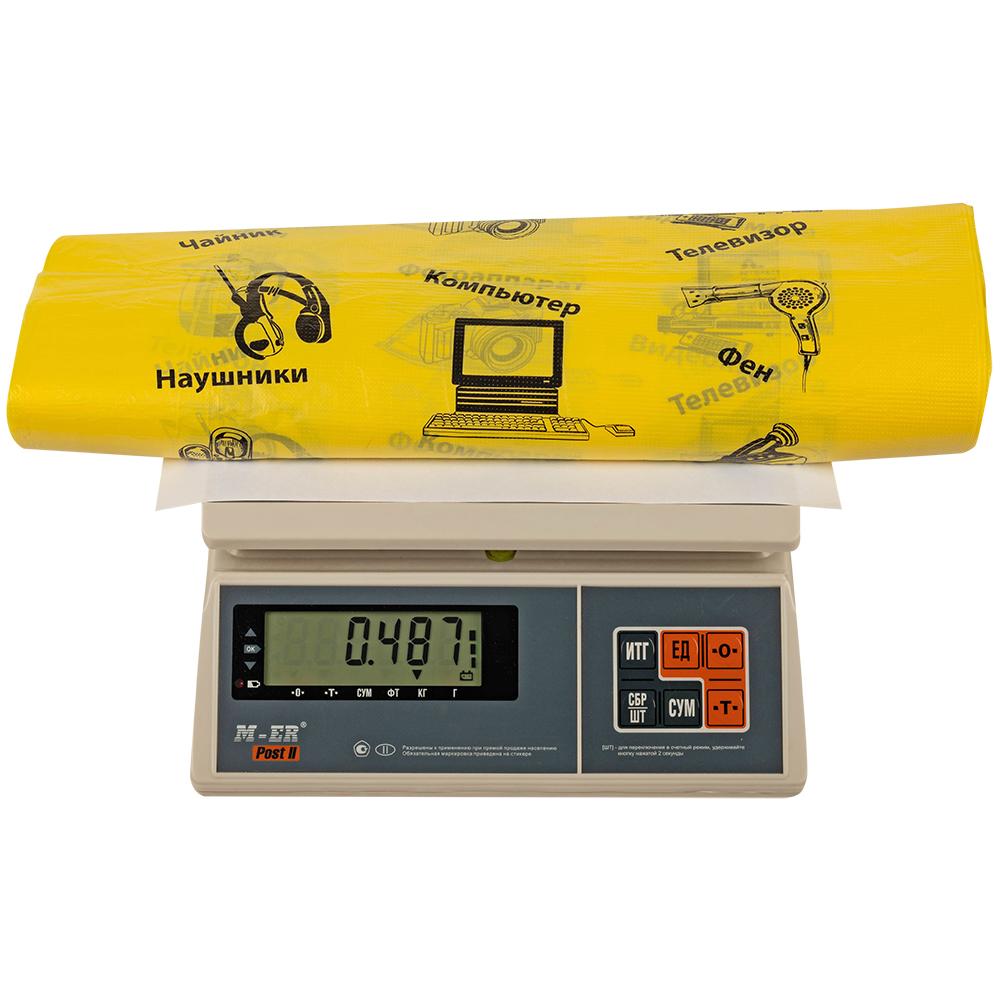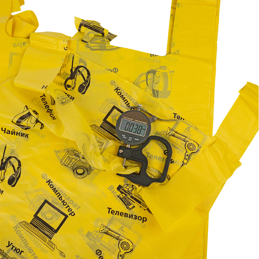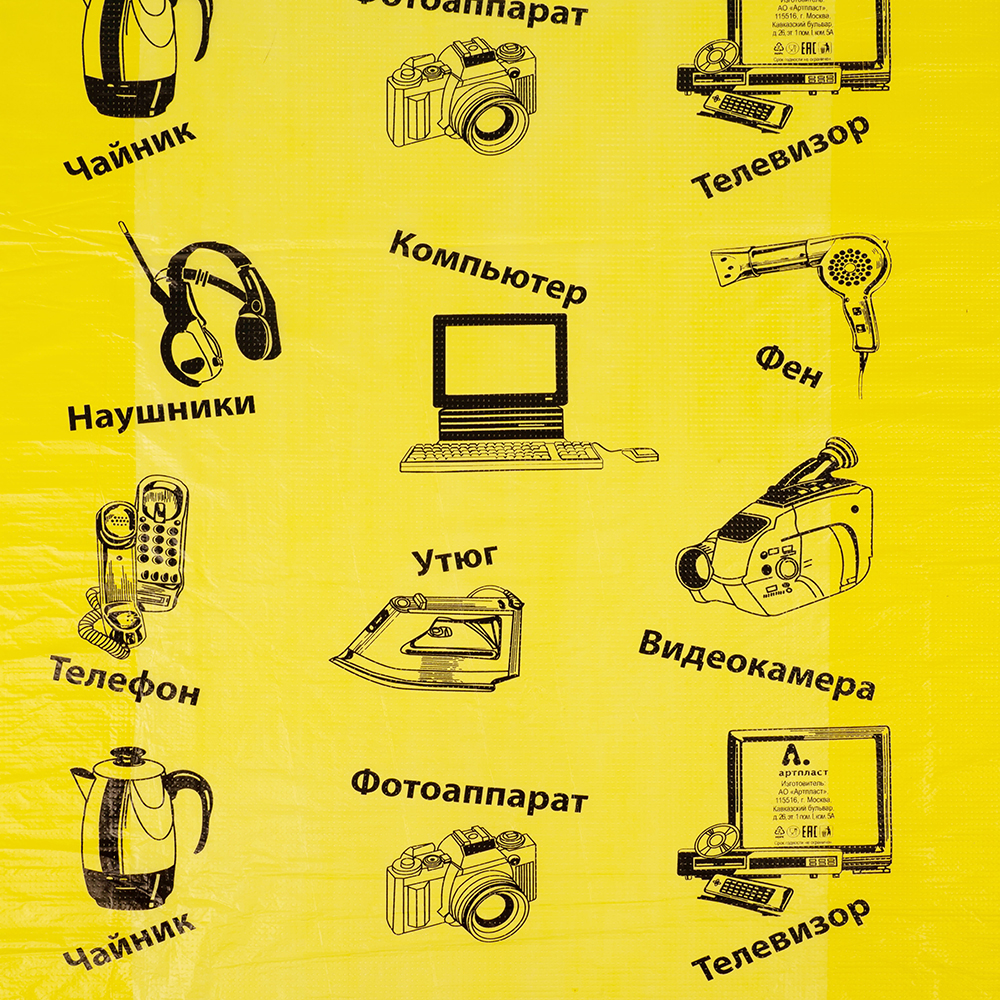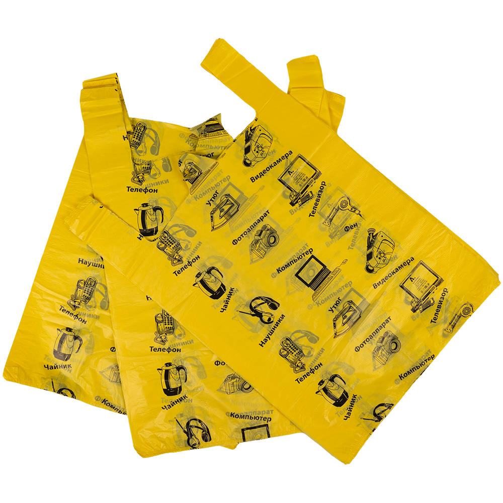 Полиэтиленовые пакеты майка ПНД «Электроника» с надписями, желтого цвета, длиной 64 см, шириной 43+20 см, толщиной 23 мкм, в упаковке 50 штук. Материал – полиэтилен низкого давления. Производятся в России.