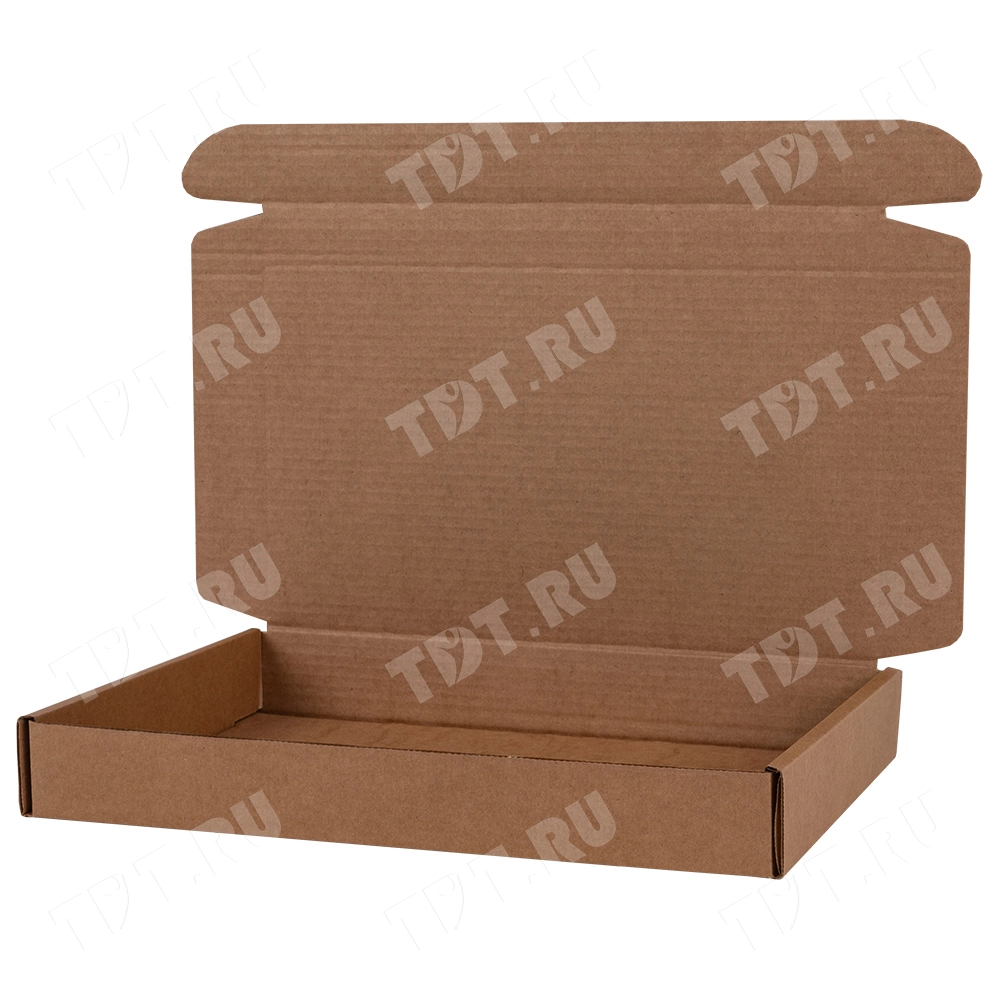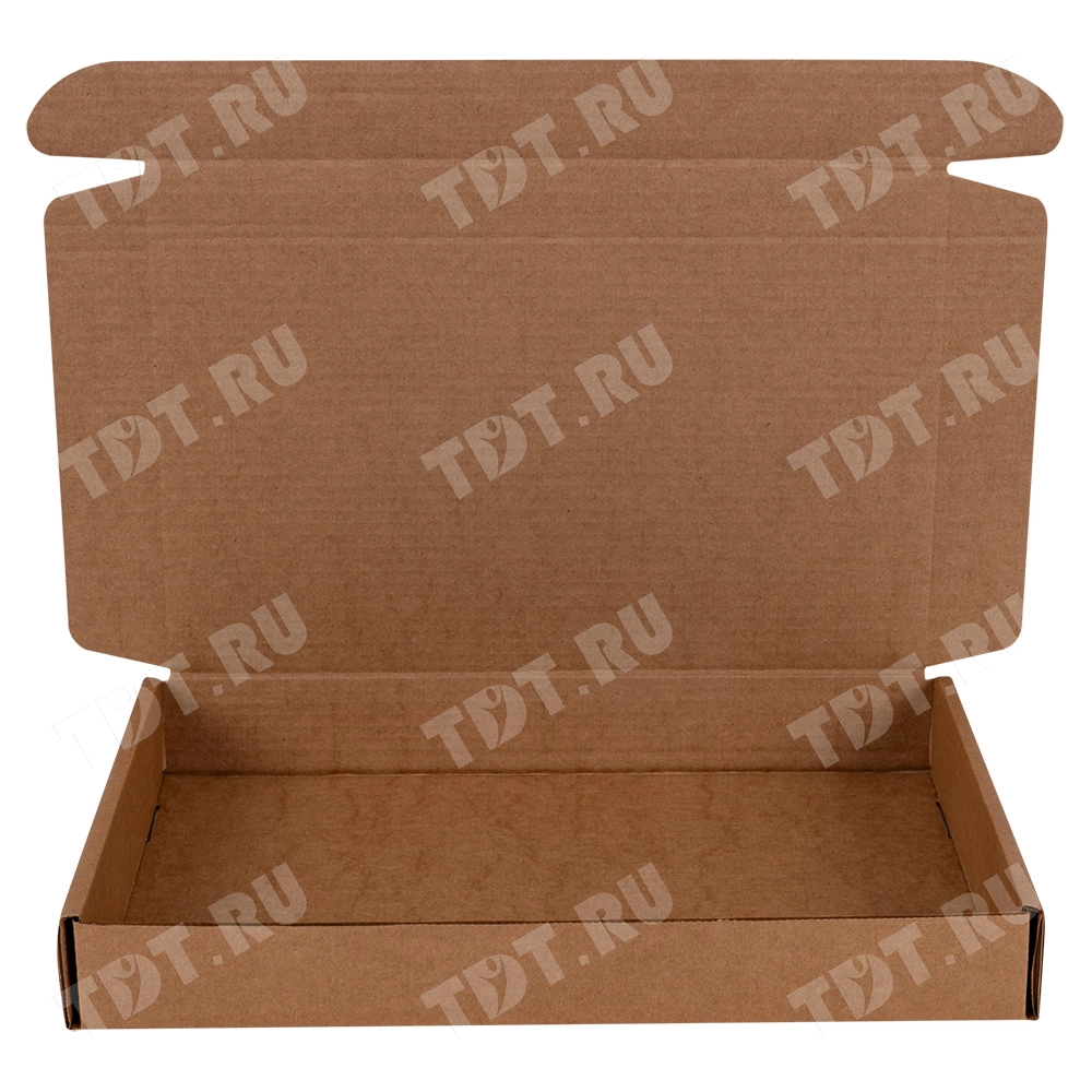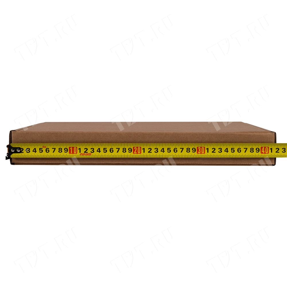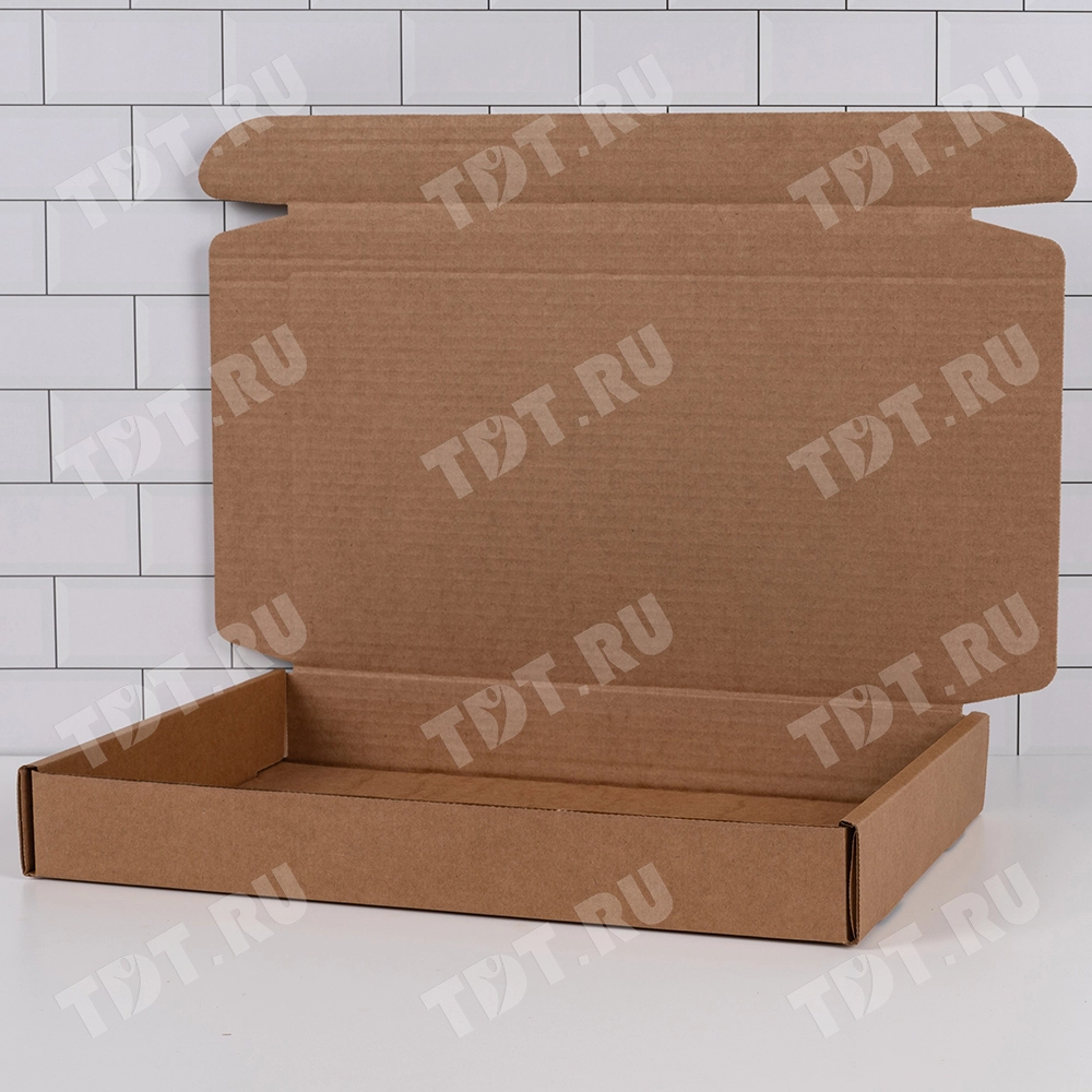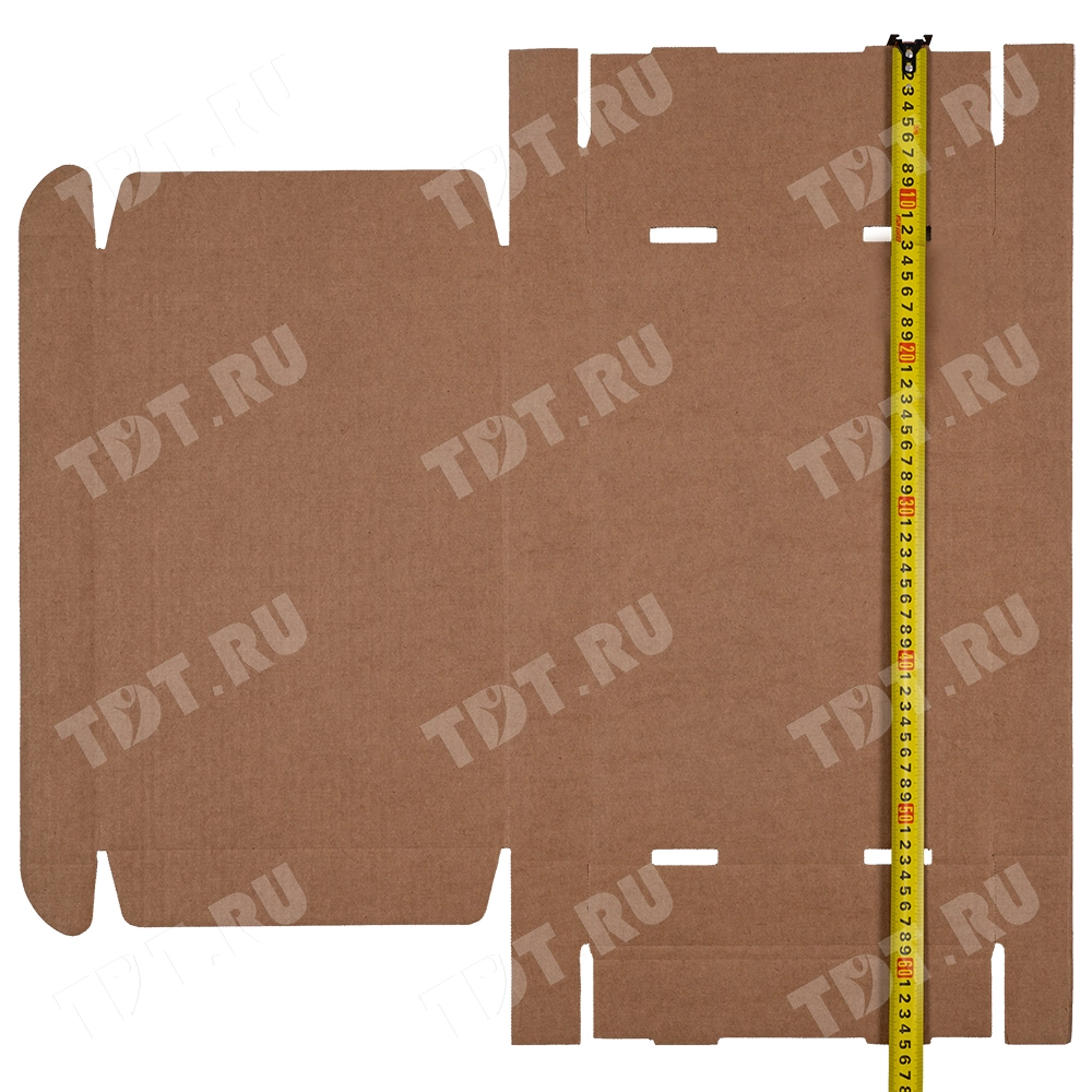 Короб №49 бурого цвета, длиной 390 мм, шириной 260 мм и высотой 50 мм. Изготовлен из гофрокартона Т-23 В. Полезный объём — 5.1 л.