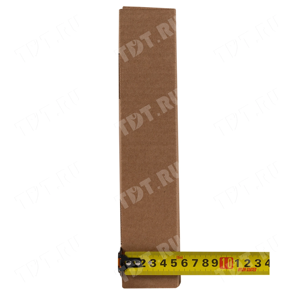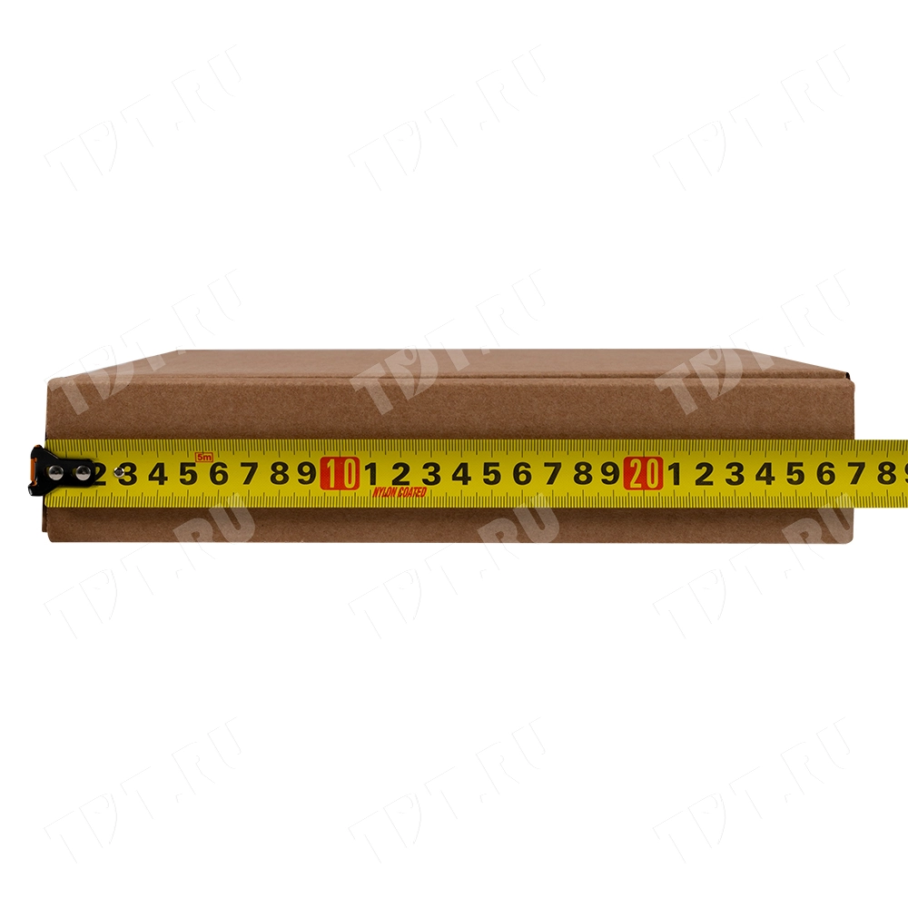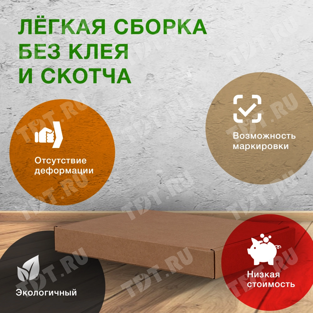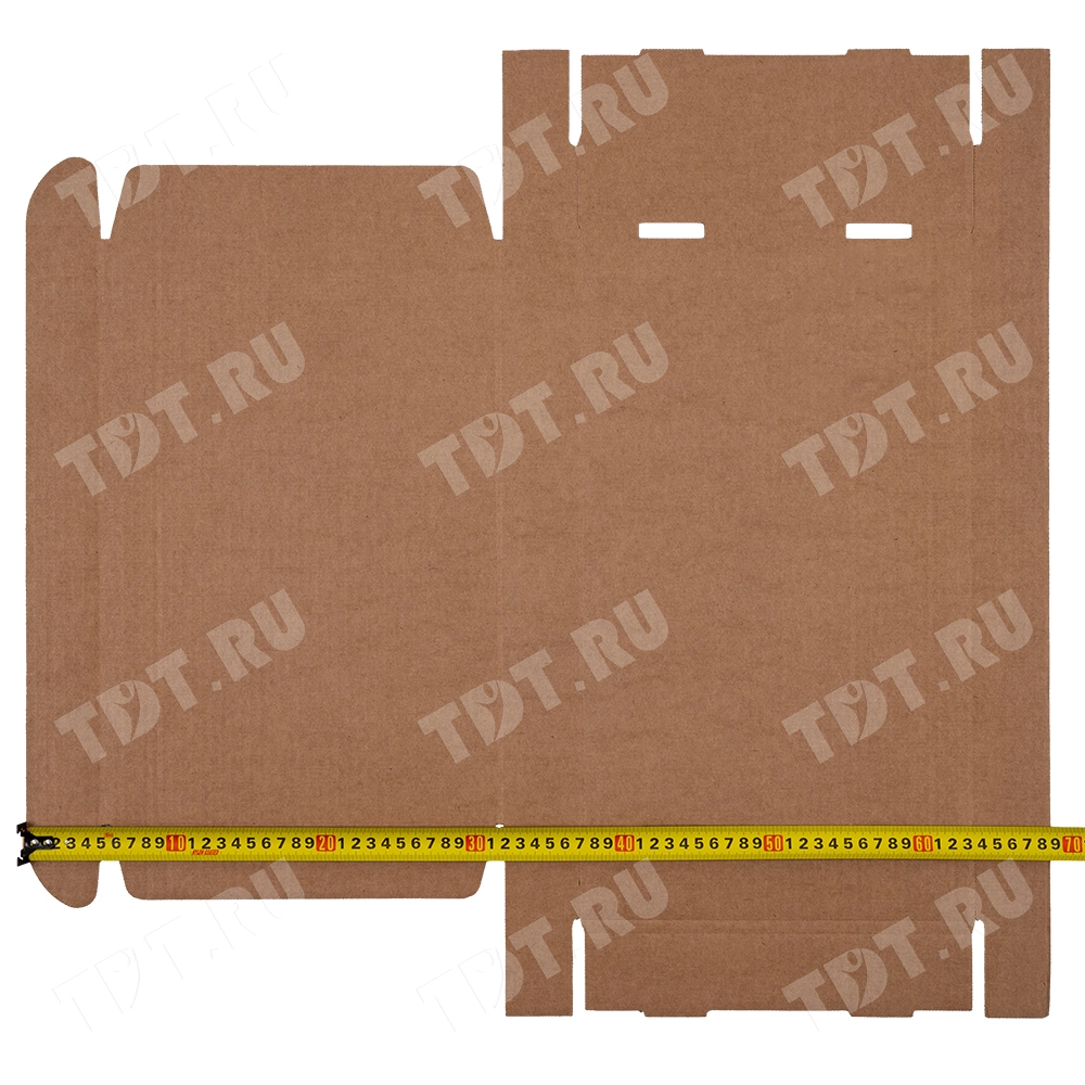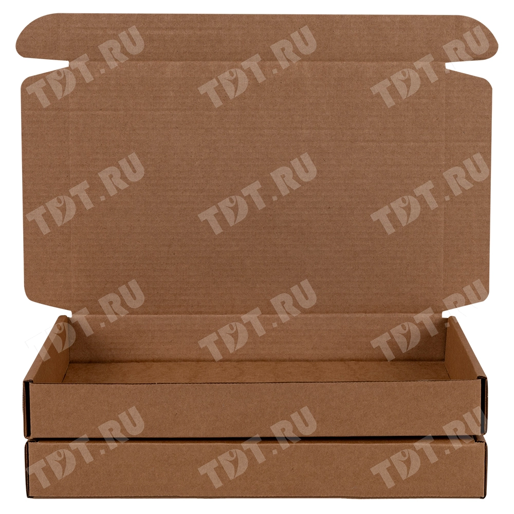 Короб №49 бурого цвета, длиной 390 мм, шириной 260 мм и высотой 50 мм. Изготовлен из гофрокартона Т-23 В. Полезный объём — 5.1 л.