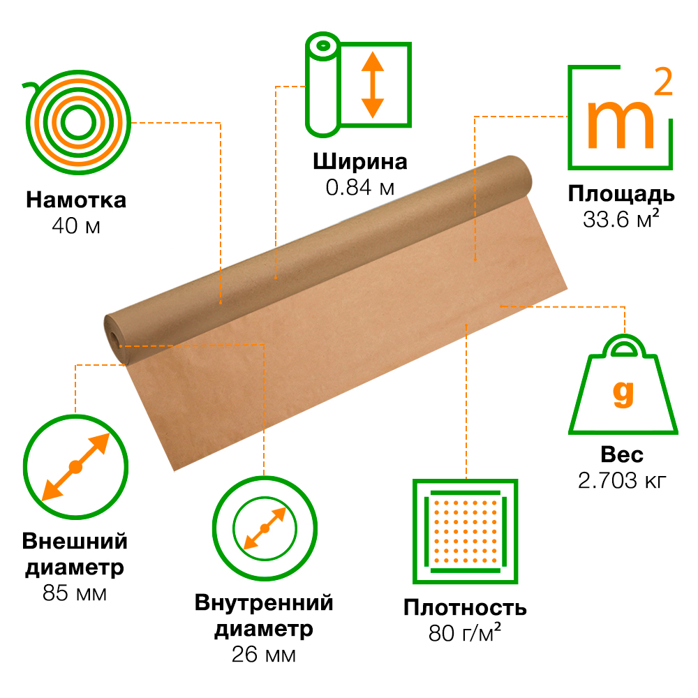 Оберточная крафт бумага в рулоне, шириной 84 см, намоткой 40 м, плотностью 80 г/м². Экологически чистый упаковочный материал. Производится в России.