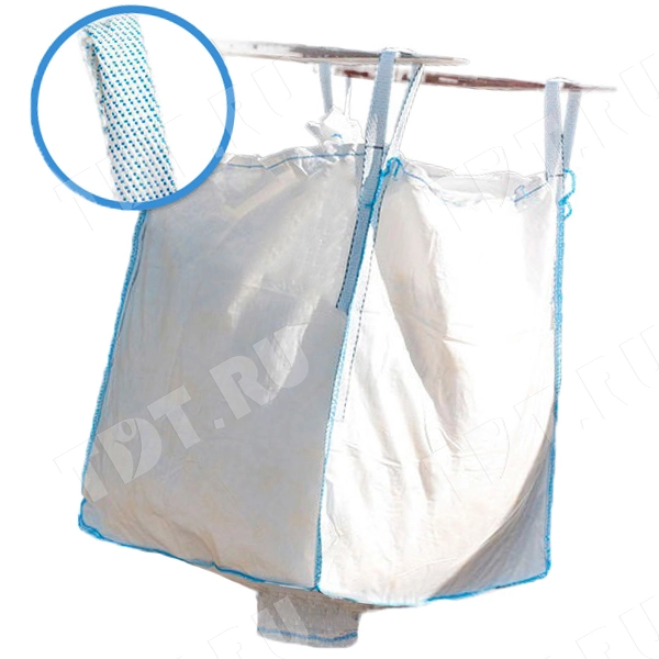 Четырехстропный биг-бэг мешок, низ люк/верх сборка, длиной 95 см, шириной 95 см, высотой 130 см, грузоподъемностью 1200 кг, весом 1.494 кг. Материал – полипропилен. Производится в России.