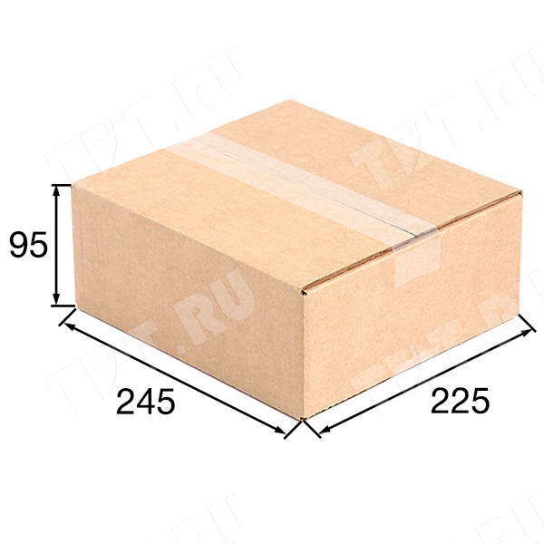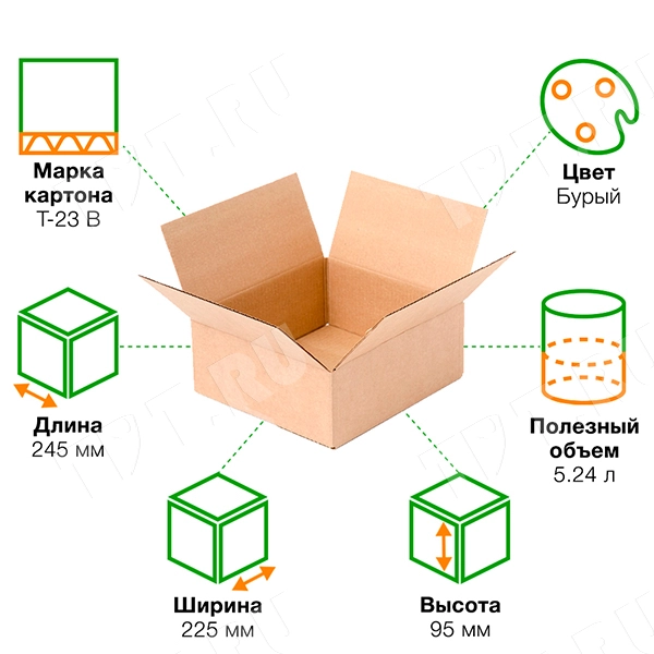 Короб К-61 бурого цвета, длиной 245 мм, шириной 225 мм и высотой 95 мм. Изготовлен из трехслойного картона марки Т-23 В. Полезный объём — 5.24 л.