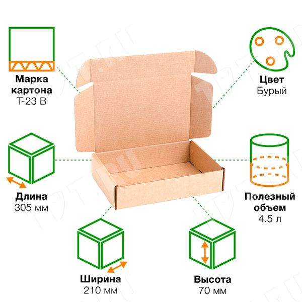 Короб №70 бурого цвета, длиной 305 мм, шириной 210 мм и высотой 70 мм. Изготовлен из гофрокартона Т-23 В. Полезный объём — 4.5 л.