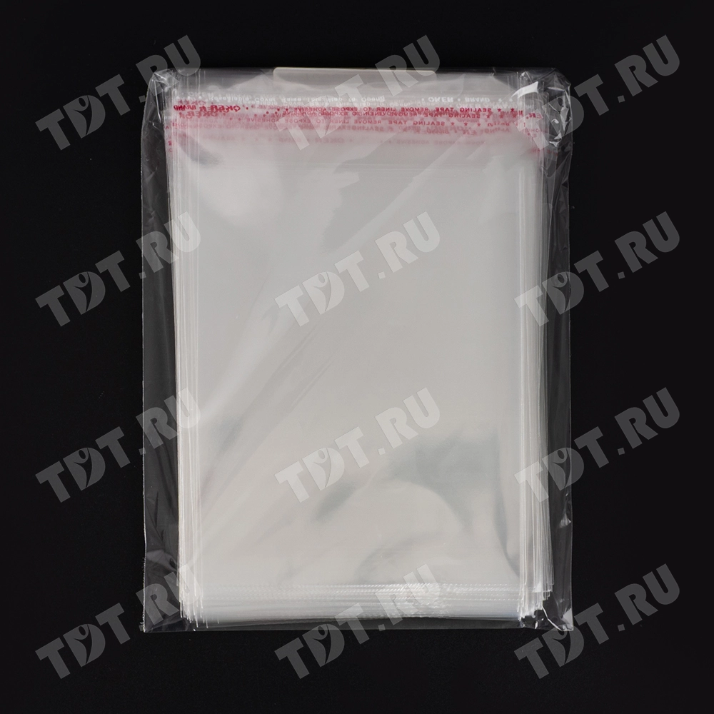 БОПП пакеты со скотчем, прозрачного цвета, длиной 10 см, шириной 8 см, толщиной 25 мкм, со стандартным клапаном 3 см, в упаковке по 100 штук. Материал – полипропилен. Производятся в России.