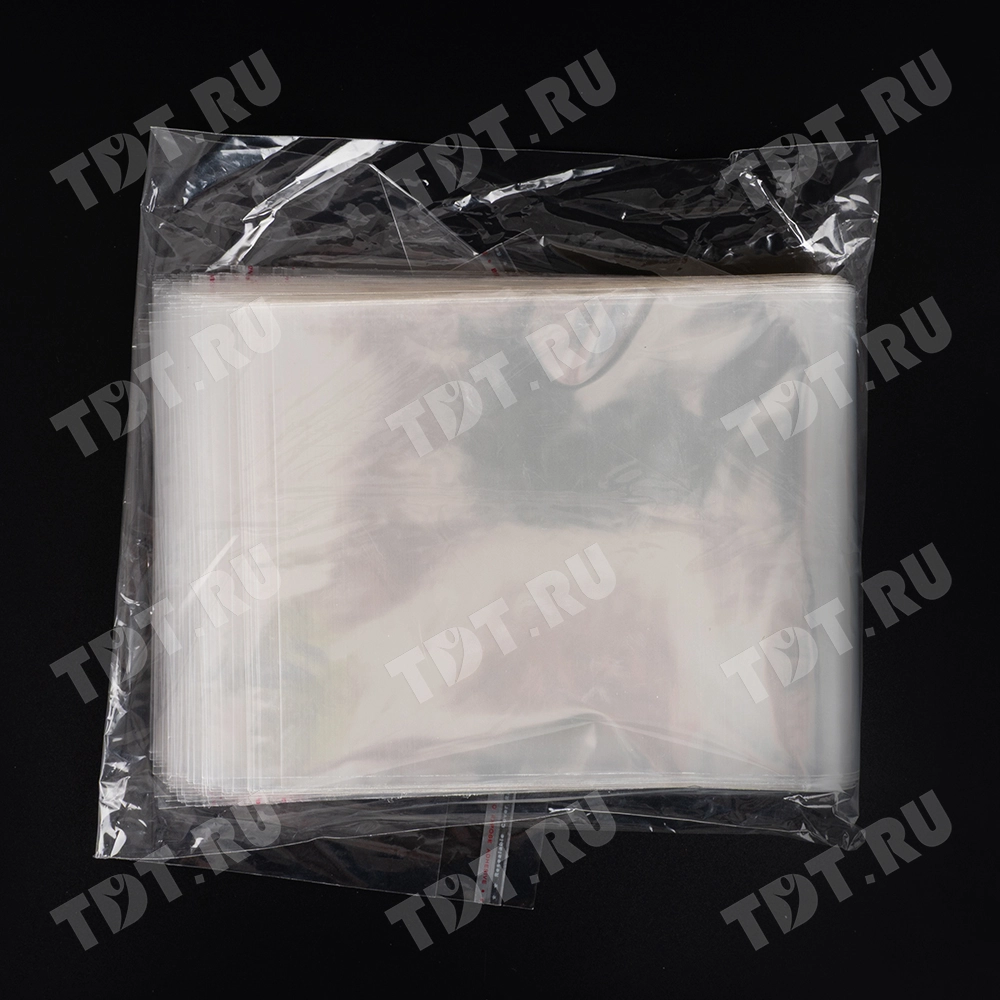 БОПП пакеты со скотчем, прозрачного цвета, длиной 38 см, шириной 15 см, толщиной 25 мкм, со стандартным клапаном 3 см, в упаковке по 100 штук. Материал – полипропилен. Производятся в России.
