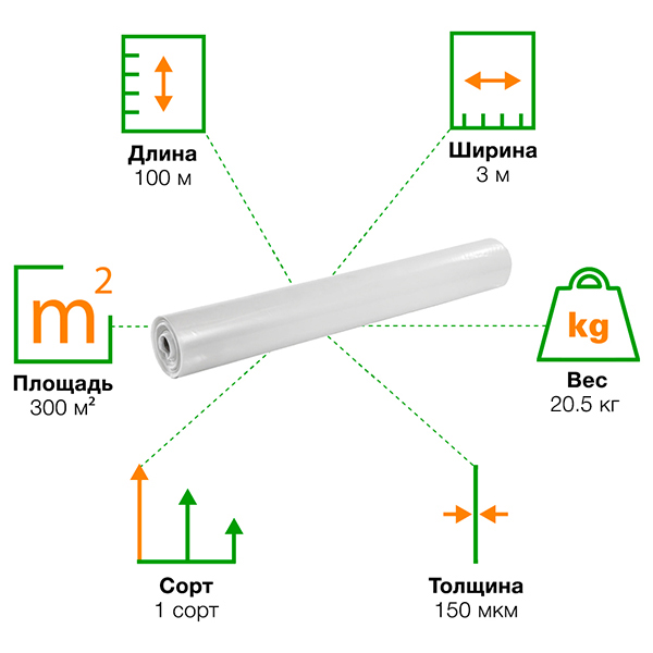 Прозрачная пленка ПВД (1 сорта) в рулоне, толщиной 150 мкм, шириной 1,5 м, длиной 100 м, общей площадью в 300 м². Пленка производится в России.