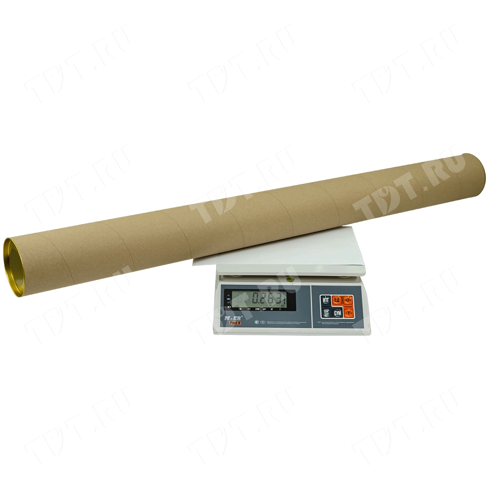 Картонный тубус с металлической крышкой и дном, бурого или светло-серого цвета, диаметром 92 мм, высотой 1000 мм, толщиной 1.2 мм, весом 285 г, транспортировочным объемом 0.008464 м³. Материал – прочный многослойный картон. Производится в России.