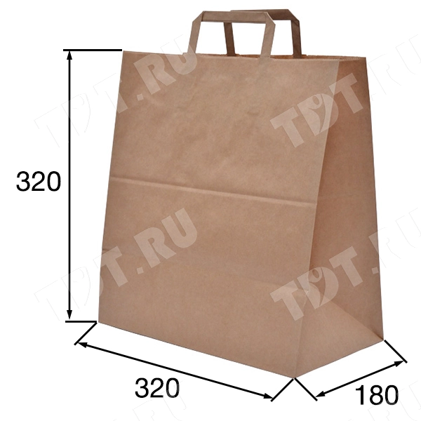 Бумажный крафт пакет с плоской ручкой шириной 180 мм, длиной 320 мм, высотой 320 мм изготовлен из экологичного материала. Пакеты производятся в России.