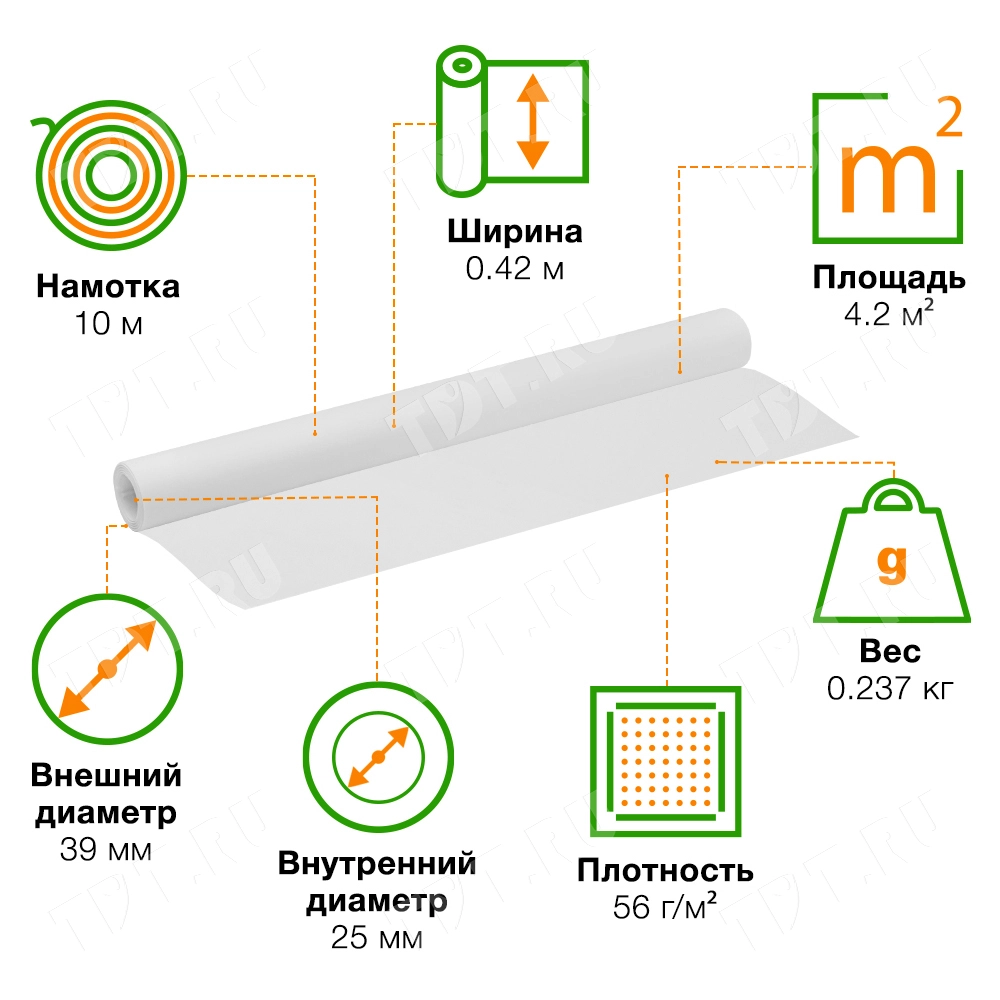 Пергамент в рулоне, белого цвета, шириной 42 см, намоткой 10 м. Флористический пергамент изготовлен из натуральной целлюлозы. Прочный, не боится влаги. Производится в России.