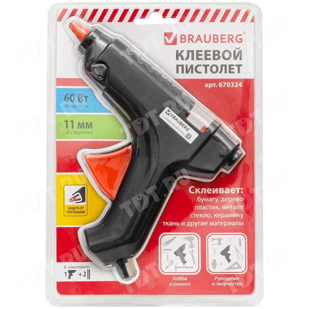 Клеевой пистолет горячего плавления Brauberg под стержни 11 мм, код производителя 670324, черного цвета, мощностью 60 Вт, производительностью 12 г/мин. В комплекте: пистолет и 2 стержня. Клеевой пистолет с защитой от протикания. Материал – высокопрочный пластик. Производится в Китае.