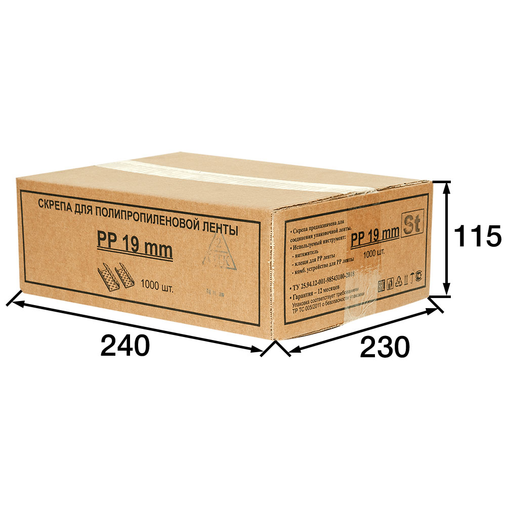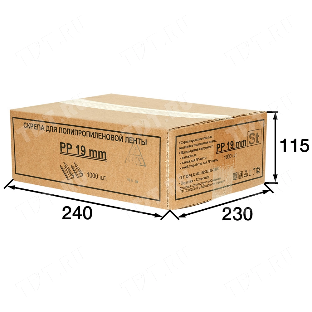 Металлические скобы для полипропиленовых лент (ПП), шириной 19 мм, толщиной 0.5 мм, в упаковке по 1000 шт, весом 4.79 кг, транспортировочным объемом 0.006348 м³. Скобы подходят для лент шириной 19 мм. Производятся в России.