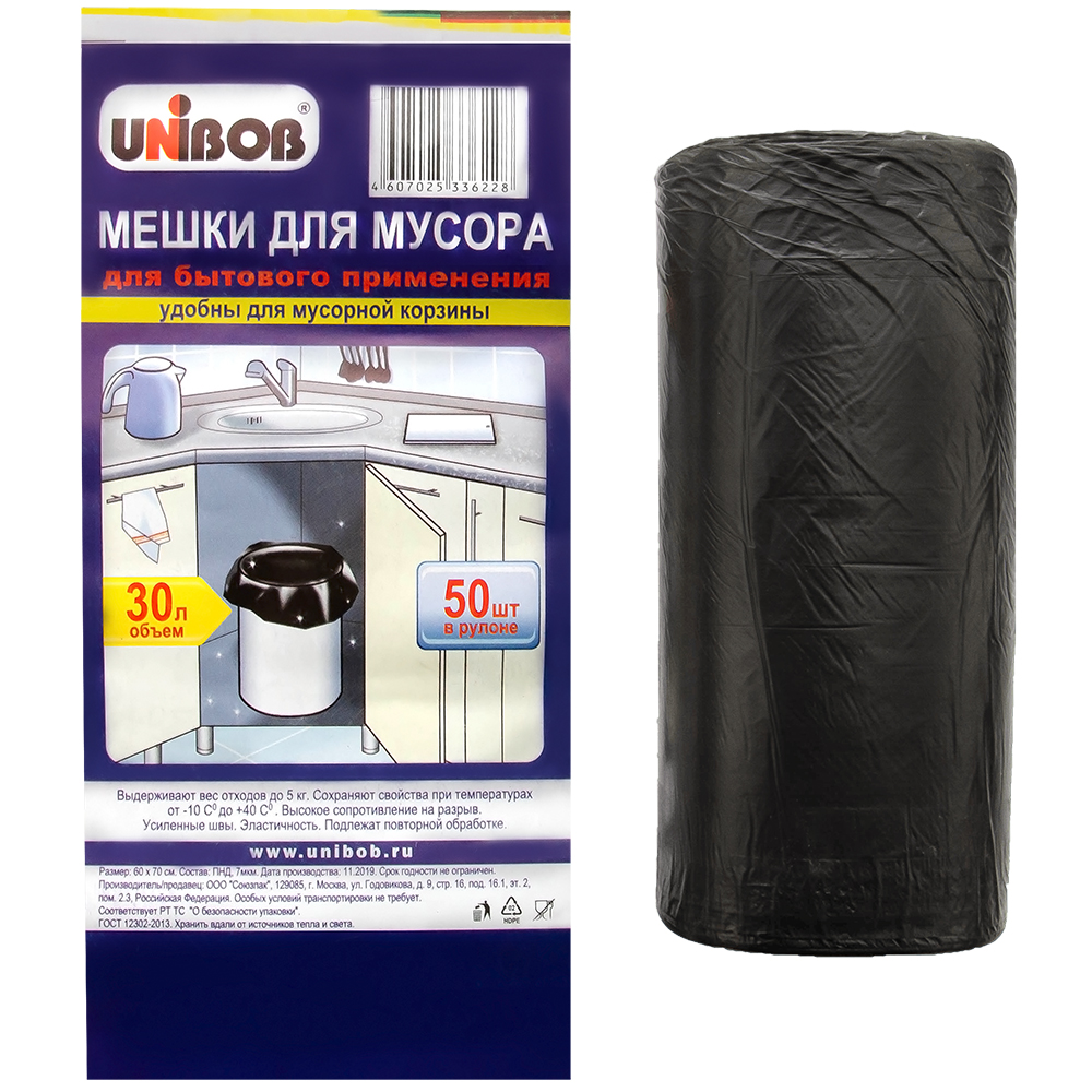 Мешки Unibob для бытового применения (удобны для мусорной корзины), черного цвета, объемом 30 л, длиной 60 см, шириной 50 см, толщиной 7 мкм, в упаковке по 50 штук. Изготовлены из полиэтилена низкого давления (ПНД). Производятся в России.