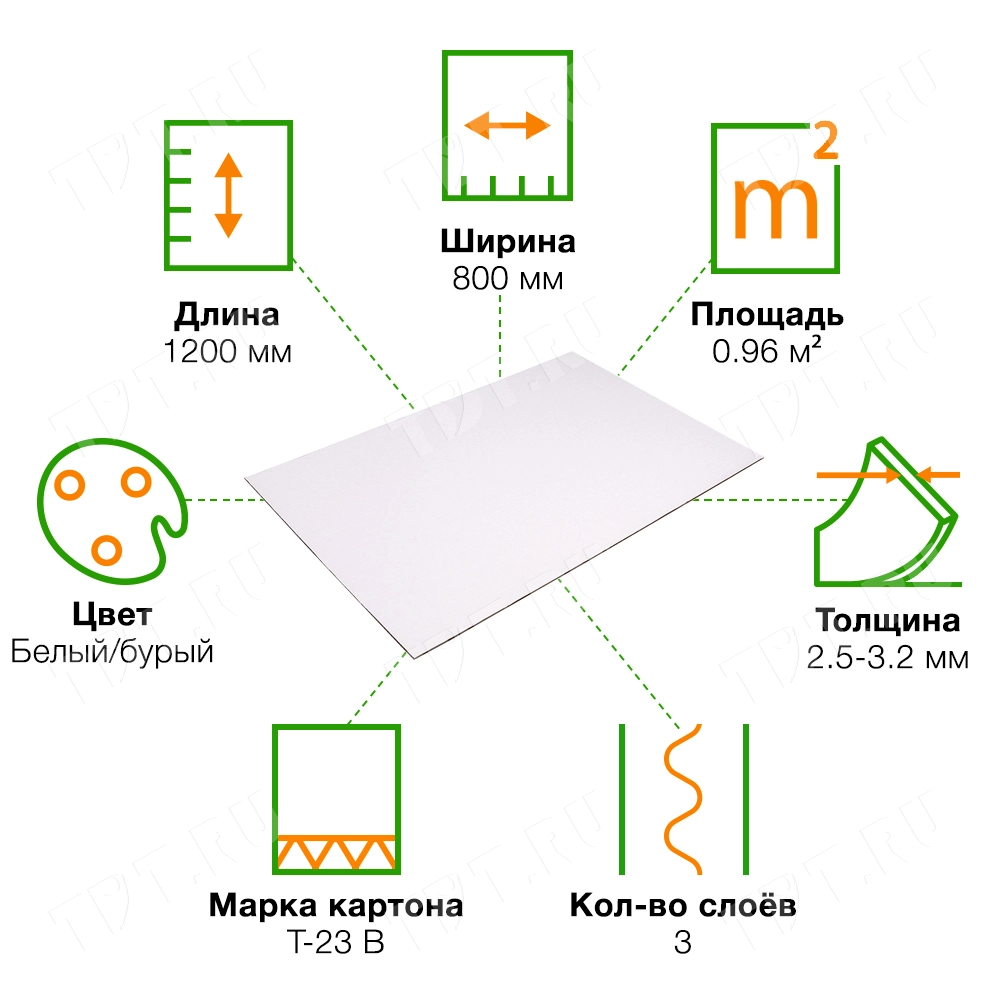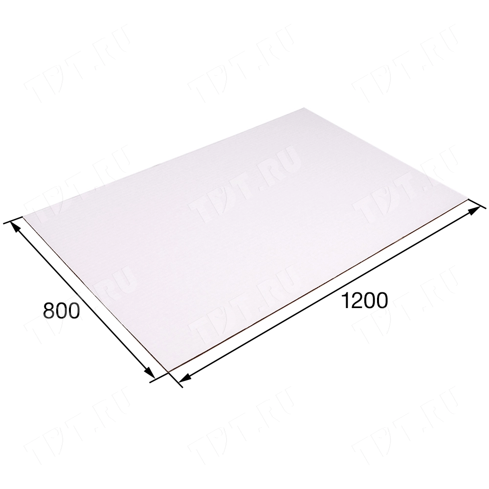 Трехслойный лист гофрокартона бело-бурого цвета, марки Т-23 В, длиной 1200 мм, шириной 800 мм, толщиной 2.5-3.2 мм, площадью 0.96 м². Производится в России.