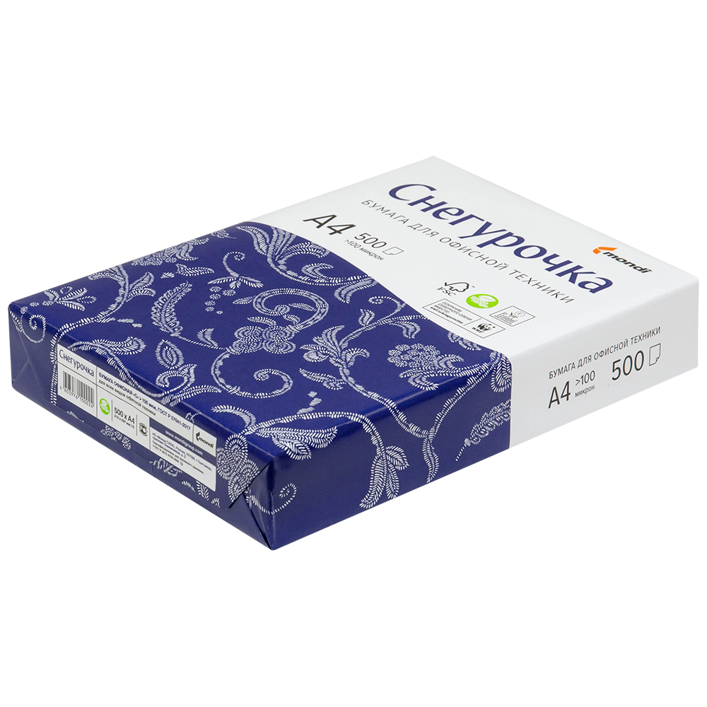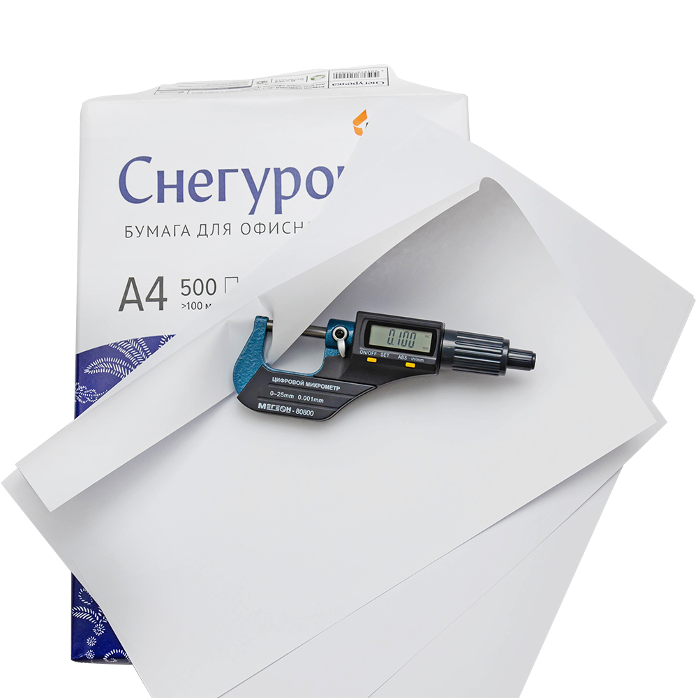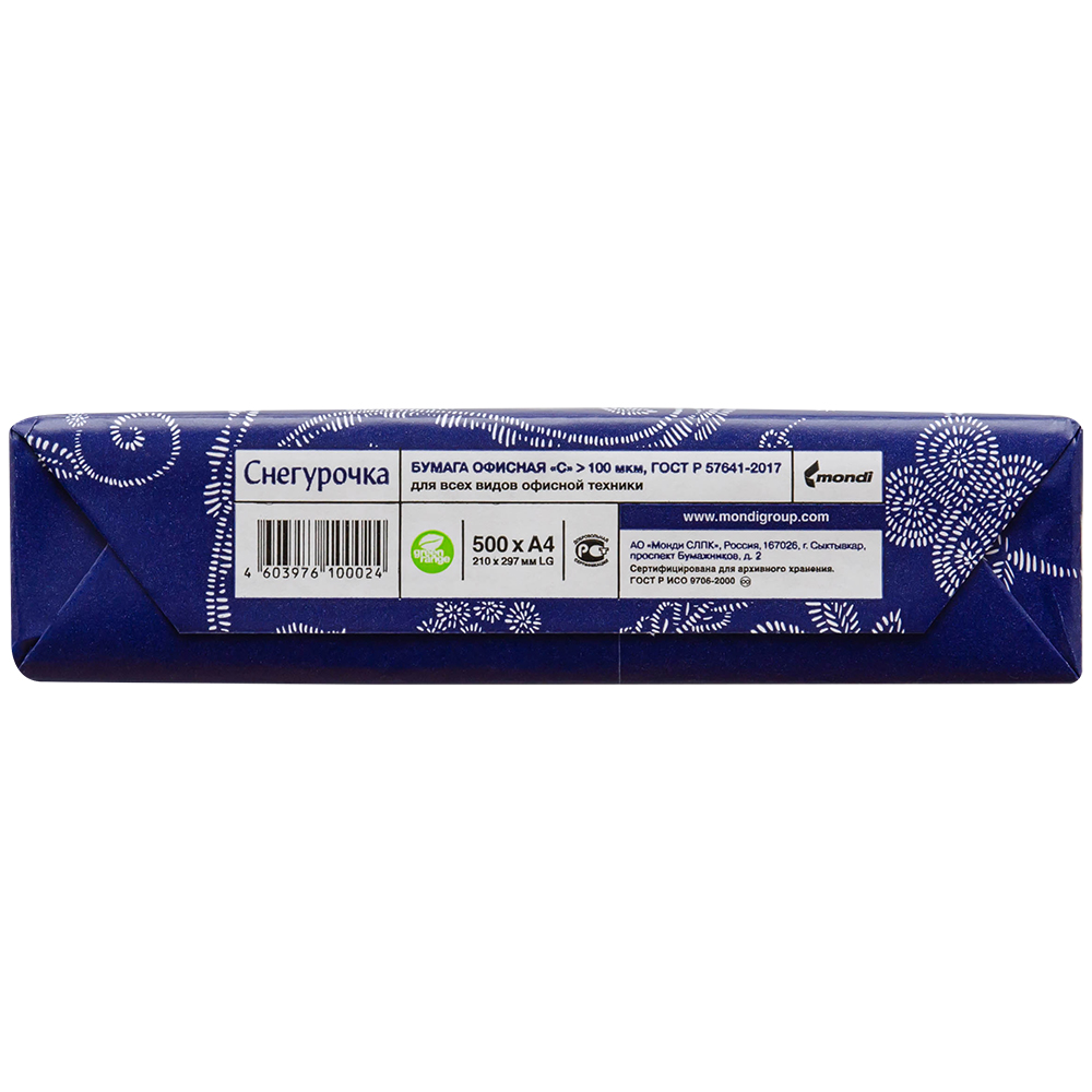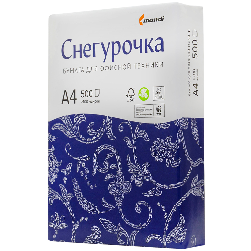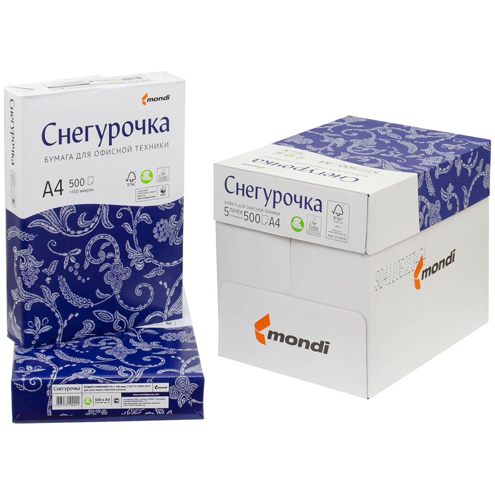 Офисная бумага Снегурочка (белого цвета), формата А4, диной 297 мм, шириной 210 мм, классом бумаги C, плотностью бумаги 80 г/м², толщиной 100 мкм, белизной 146%, яркостью 96%, в упаковке по 500 штук, весом 2.416 кг. Производится в России.