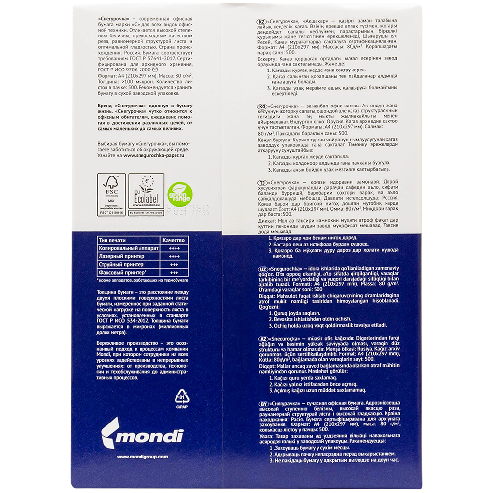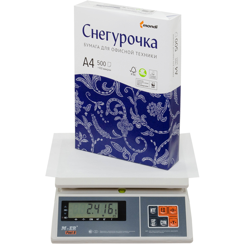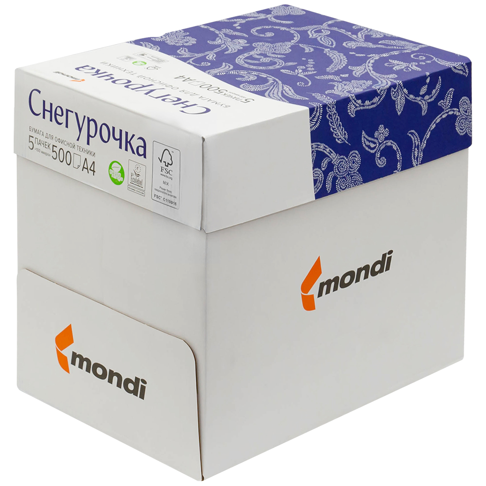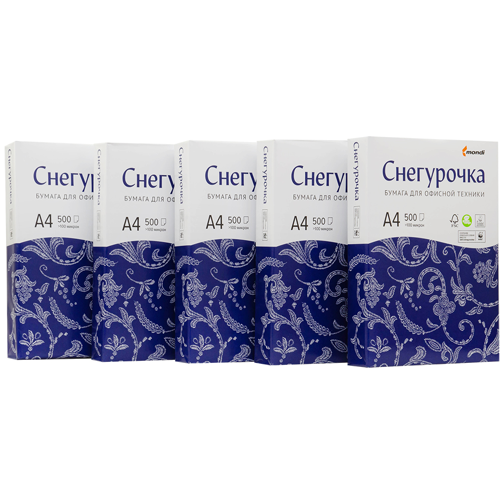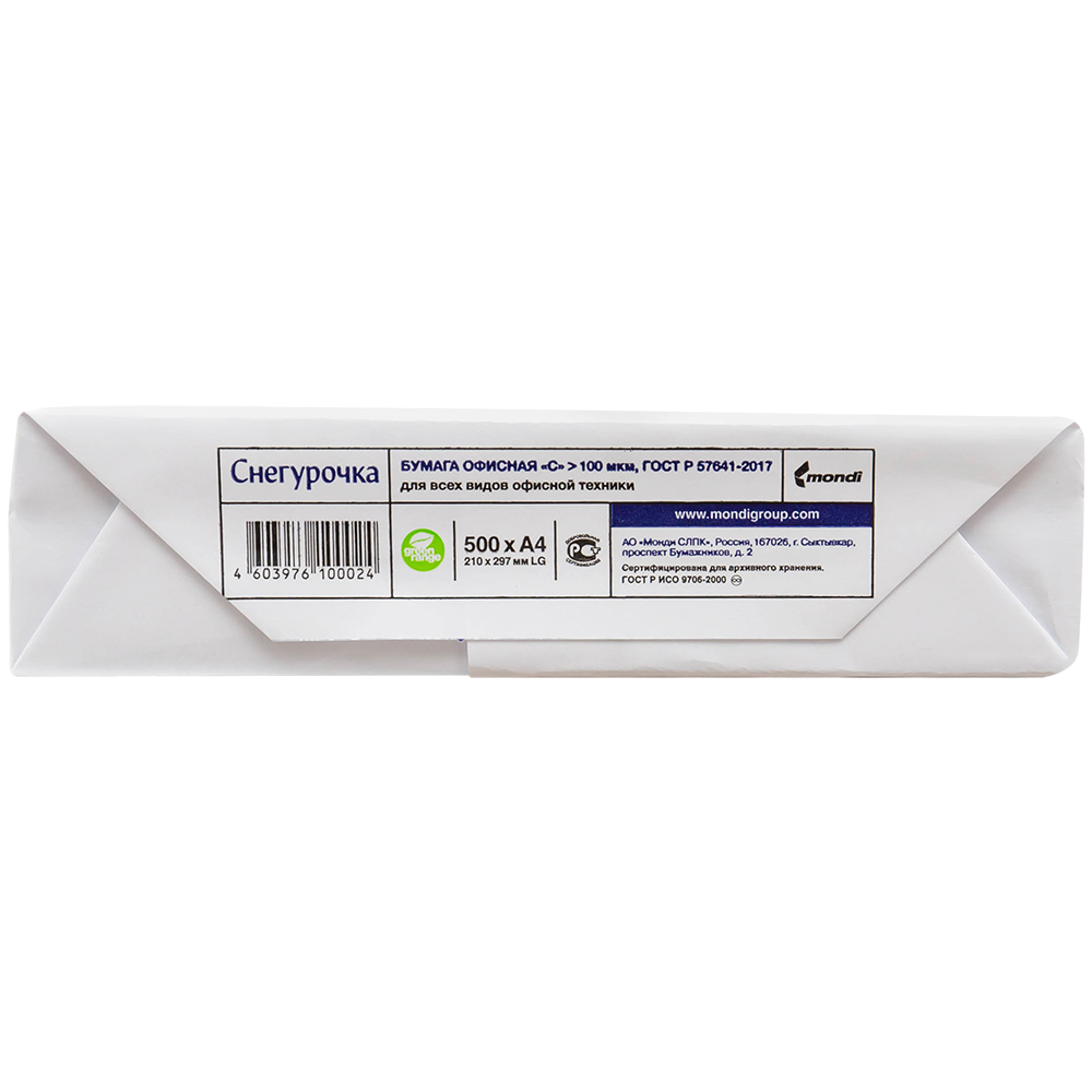 Офисная бумага Снегурочка (белого цвета), формата А4, диной 297 мм, шириной 210 мм, классом бумаги C, плотностью бумаги 80 г/м², толщиной 100 мкм, белизной 146%, яркостью 96%, в упаковке по 500 штук, весом 2.416 кг. Производится в России.