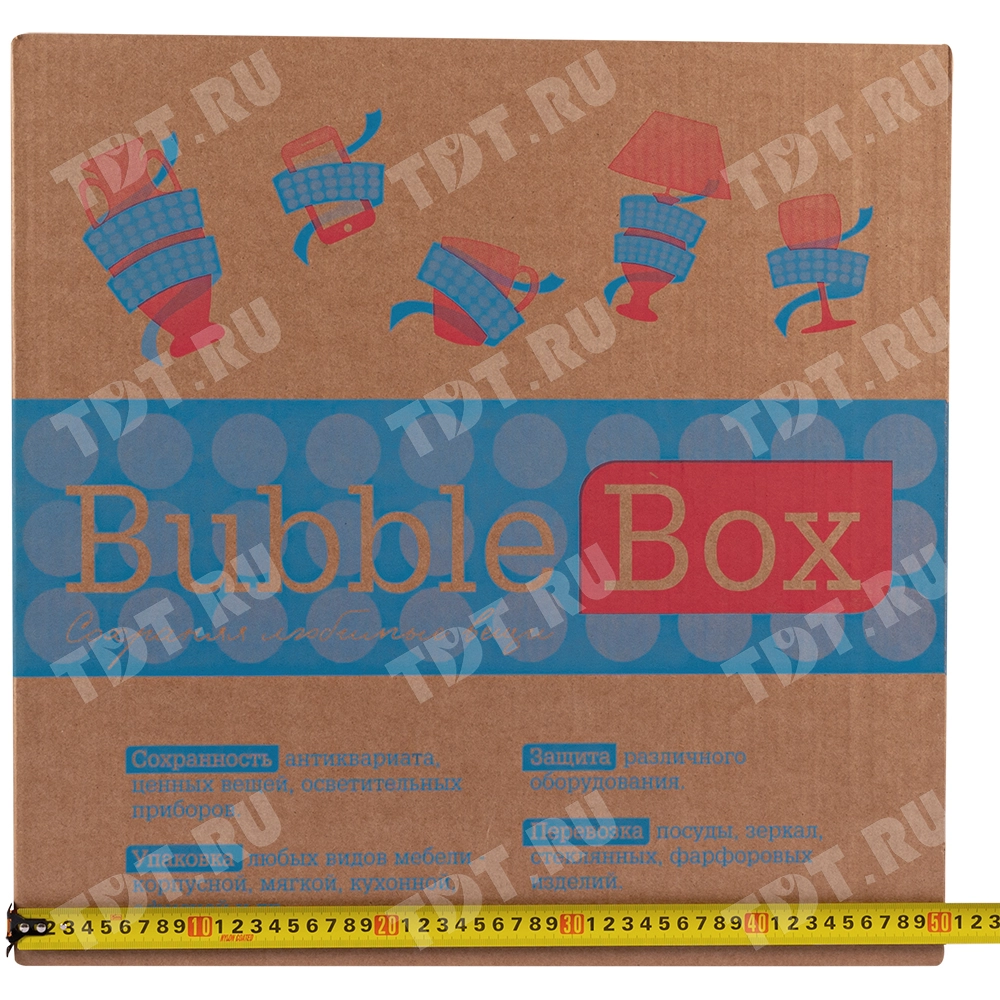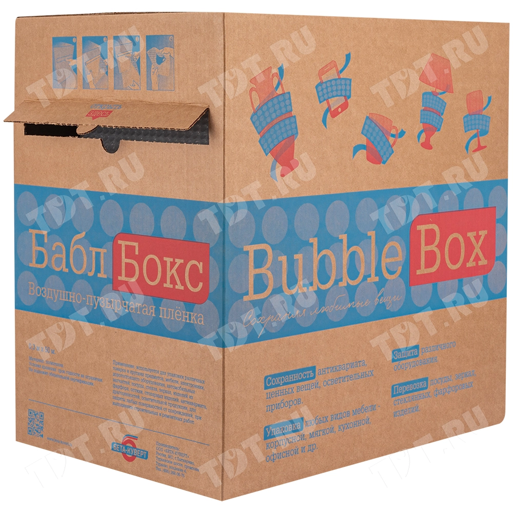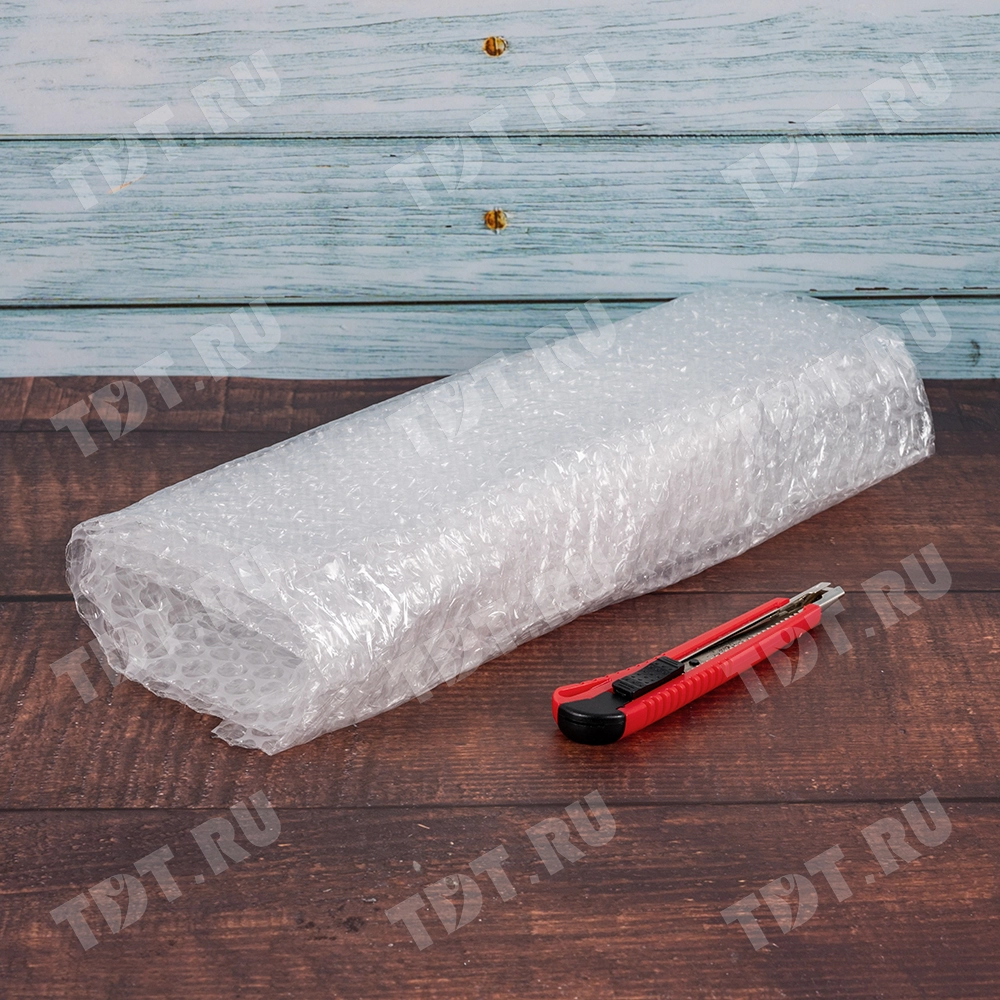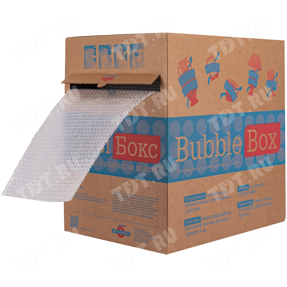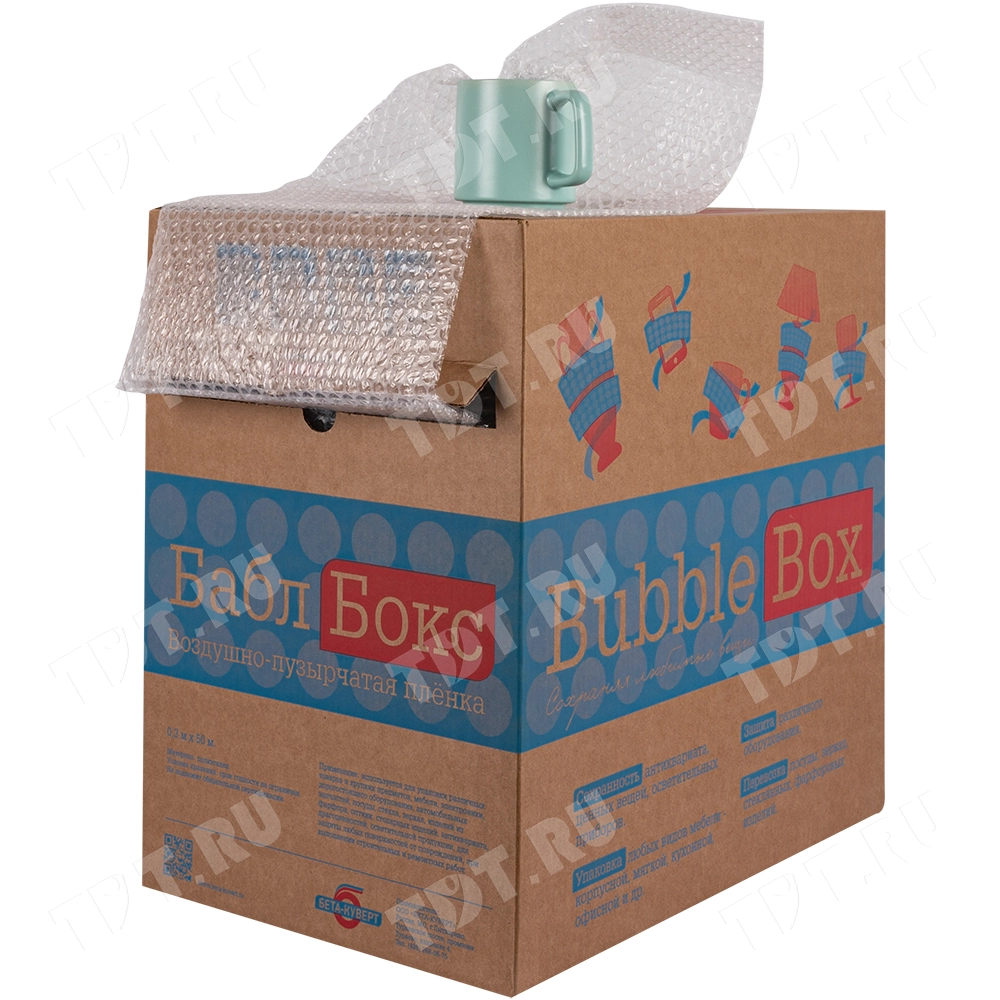 Прозрачная трехслойная воздушно-пузырчатая пленка в коробке «БаблБокс», намоткой 50 м, шириной рулона 0.3 м, диаметром пузырька 10 мм, плотностью 60 г/м². Изготовлена из полиэтилена. Производится в России.
