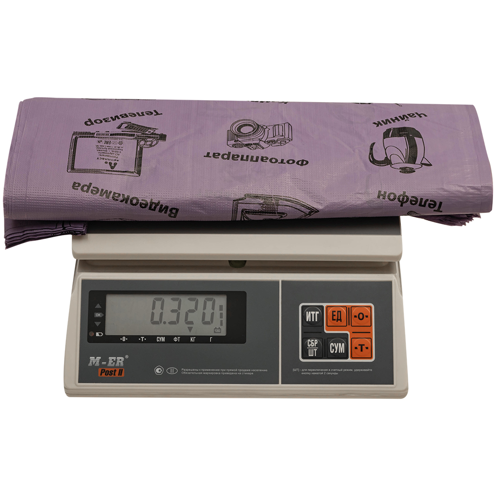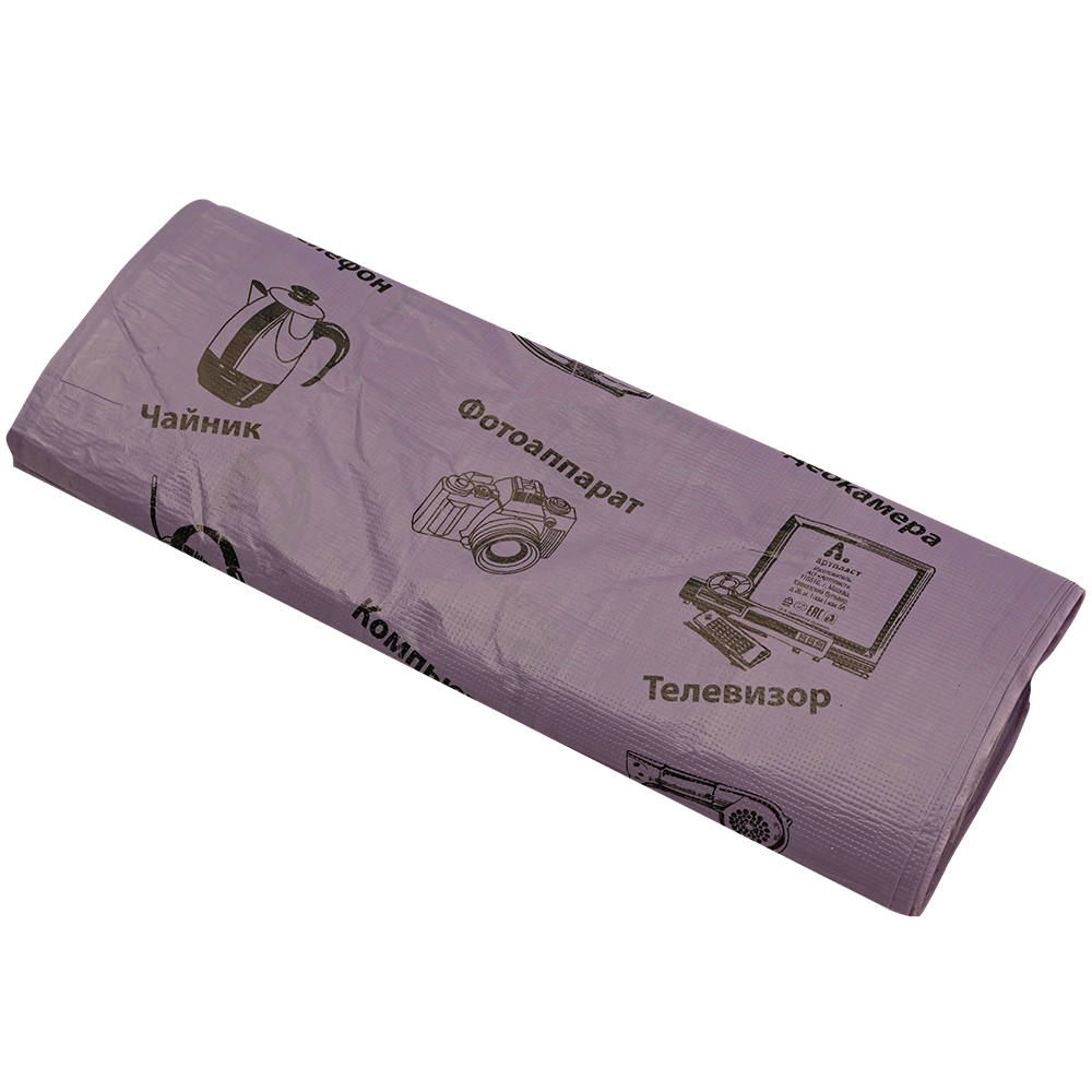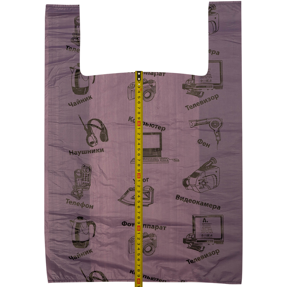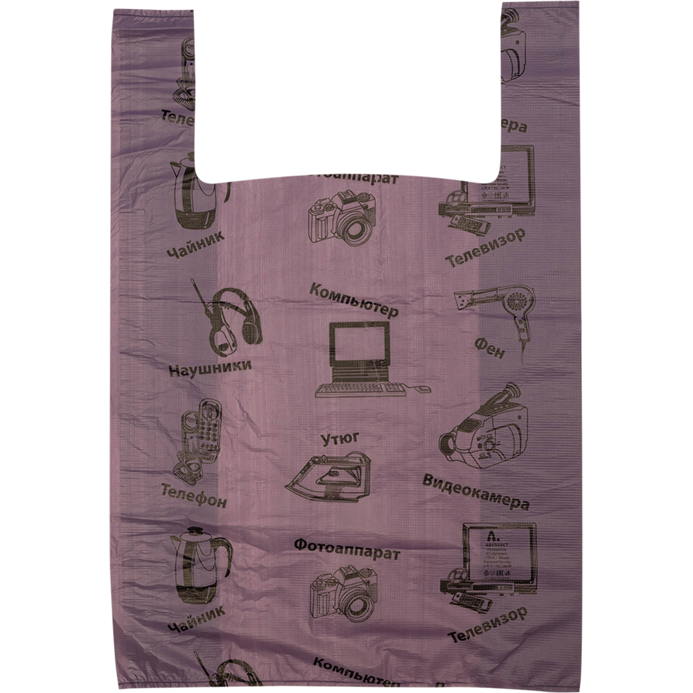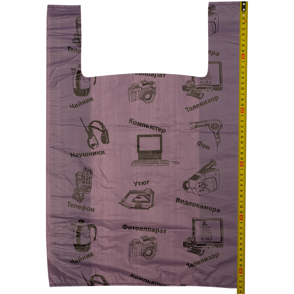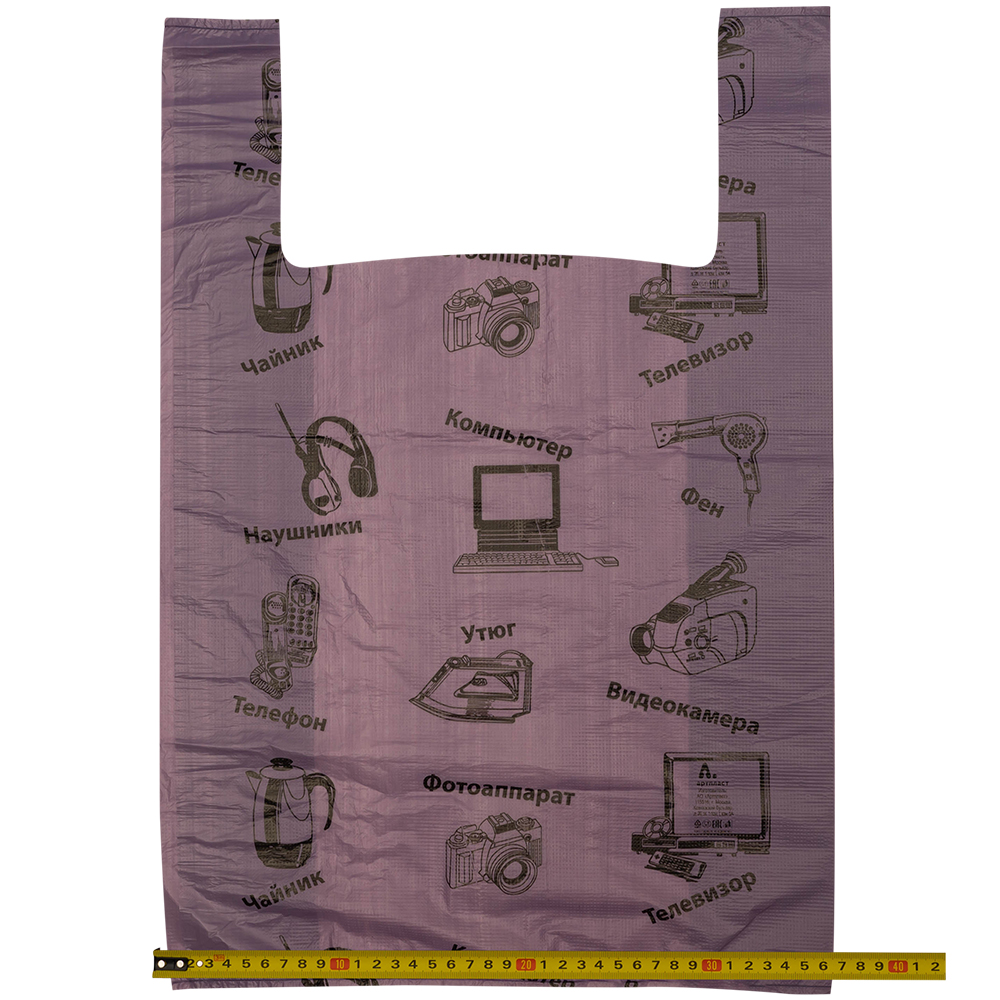 Полиэтиленовые пакеты майка ПНД «Электроника», фиолетового цвета, длиной 56 см, шириной 36+20 см, толщиной 15 мкм, в упаковке 50 штук. Материал – полиэтилен низкого давления. Производятся в России.