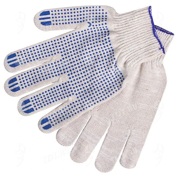Рабочие хлопчатобумажные перчатки Люкс с точечным ПВХ покрытием синего цвета. Защищают руки от повреждений и загрязнений. Производятся в России.