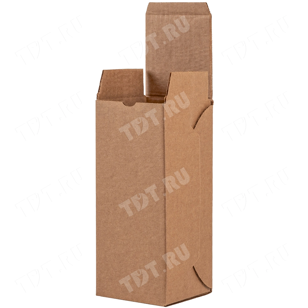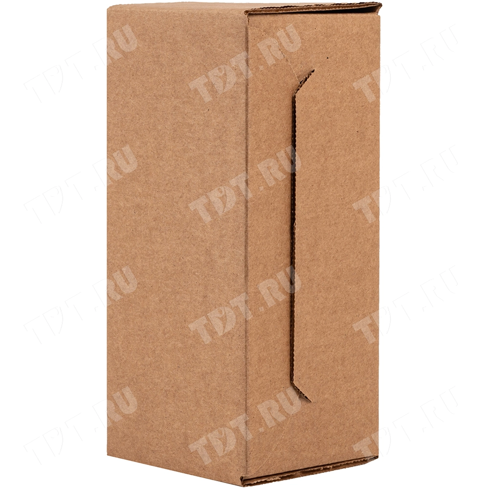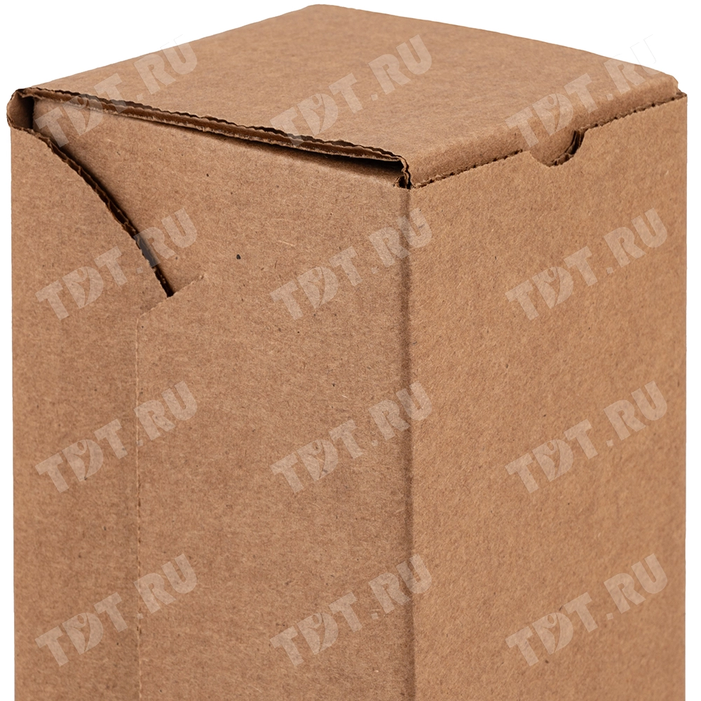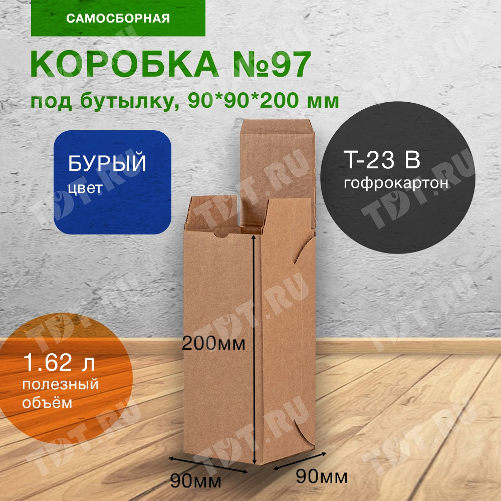 Коробка для бутылки №97, бурая, длиной 90 мм, шириной 90 мм и высотой 200 мм. Изготовлена из трёхслойного картона Т-23. Полезный объём — 1.62 л.
