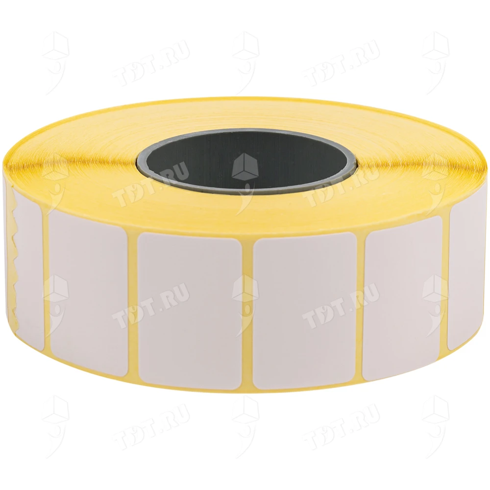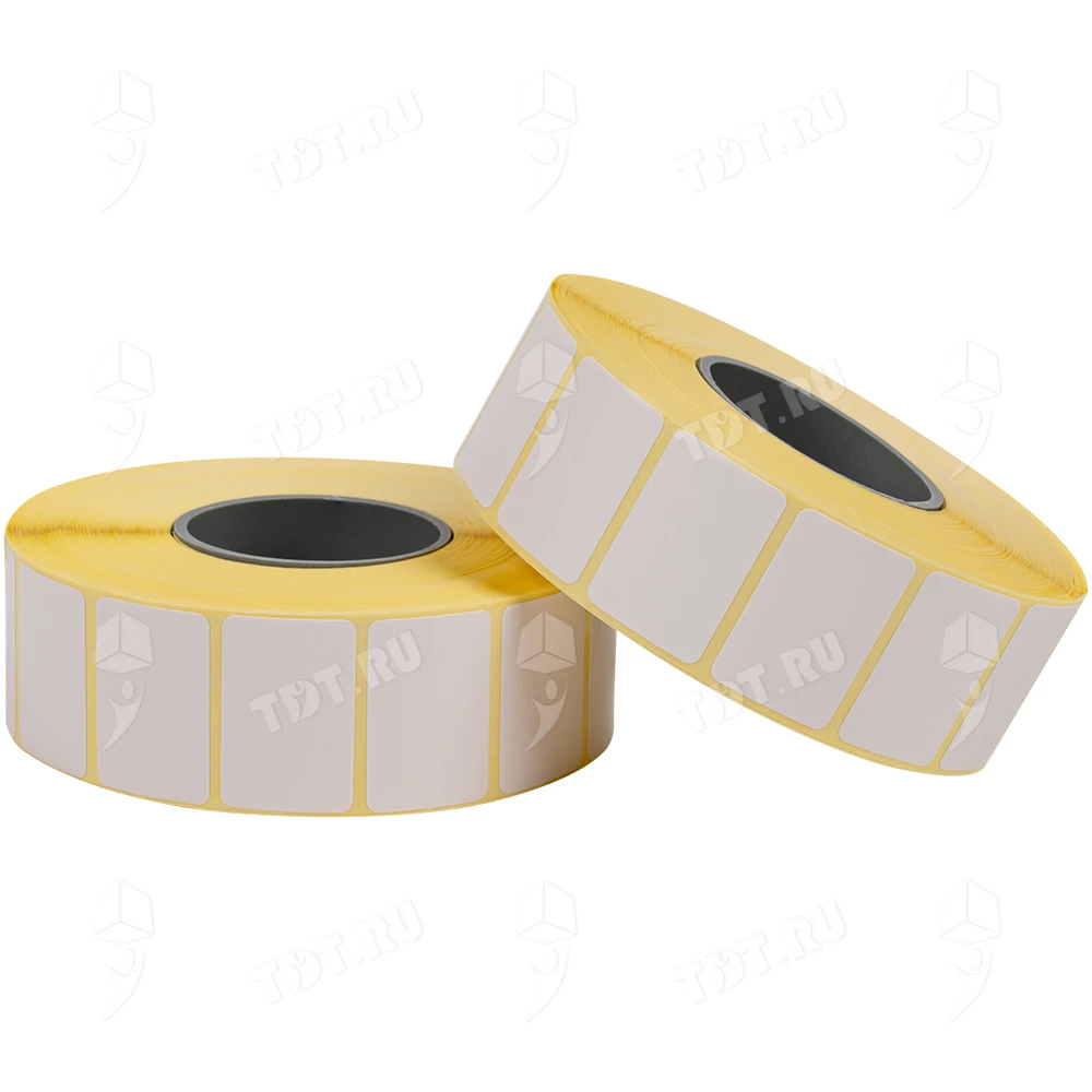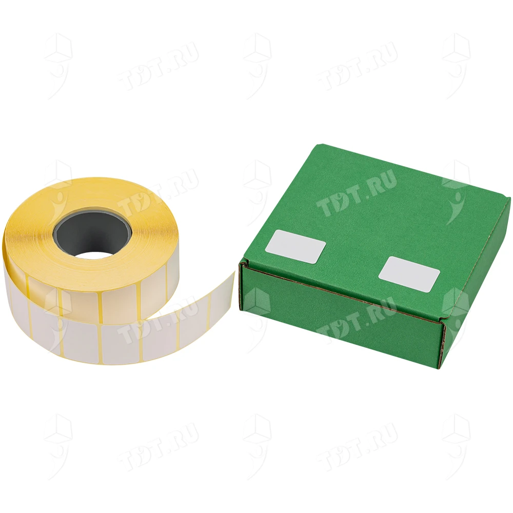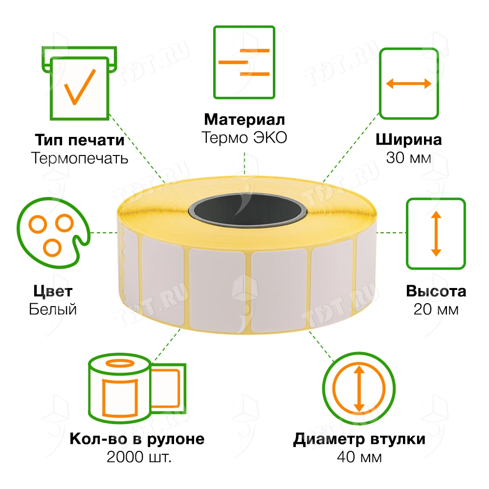 Самоклеящиеся этикетки ЭКО из матовой бумаги белого цвета, шириной 30 мм, высотой 20 мм, диаметром втулки 40 мм, количеством в рулоне по 2000 штук. Производятся в России. Термоэтикетки ЭКО в рулонах предназначены для печати на принтерах без риббона. На этикетках есть специальный слой, который при нагреве термоголовки принтера темнеет, за счет этого происходит печать.