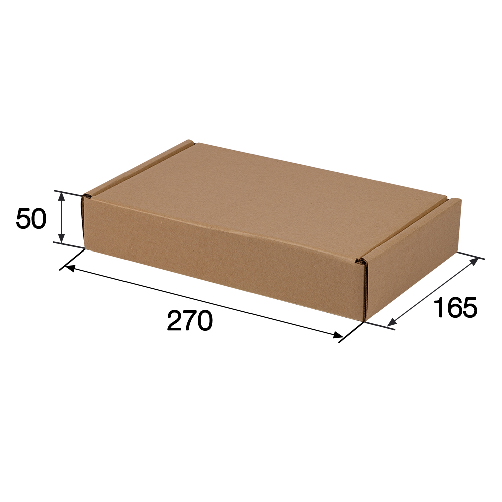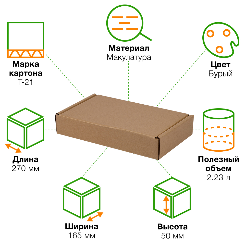 Почтовый короб «Бизнес» тип «Е» бурого цвета, длиной 270 мм, шириной 165 мм и высотой 50 мм. Изготовлен из трёхслойного гофрокартона Т-21. Полезный объём — 2.23 л.